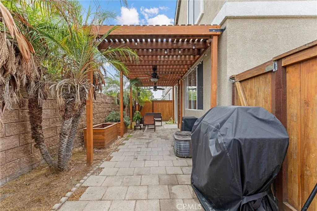 Outdoors, enjoy your private backyard oasis—perfect for relaxing or entertaining, complete with lighting and fans for year-round enjoyment.