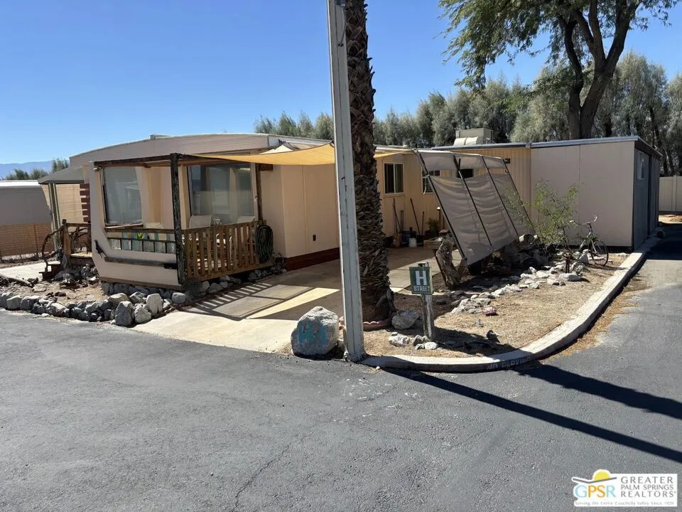 Don't miss your opportunity to own this unique, one of a kind home in Healing Waters Mobile Home & RV Park, a 55+ active community located in Desert Hot Springs. As you enter the covered indoor serenity garden, you will be awestruck by the waterfall and rock pond (ready for the fish of your choice if desired), and a Japanese inspired wooden bridge leads you to the dramatic entry doors. Artistic remodeling is highlighted throughout the home with the primary focus on repurposing, recycling and reusing. The kitchen counter tops, island, and walls boast reclaimed redwood and cedar from several parts of the state. The sink is recycled from England. Cork floors are cool in the summer and warm in the winter. There is an amazing oversized pantry, and access to the equally oversized attached workshop which also can be used for storage or a golf cart enclosure. The inclosed patio and and pantry add an approximate 500 sq. ft of usable space. Numerous creative touches abound in this 3 bed/2 bath double wide unit. The tranquil ambiance continues outside as you relax on the back deck and take in breathtaking mountain, desert and amazing sunset views. Park amenities include a large mineral spring pool, 3 mineral springs spas all open 24/7, plus wet and dry saunas, large clubhouse with banquet room, game room, library, and billards. There are also pickleball and shuffleboard courts. Hurry, you have to check this treasure out!