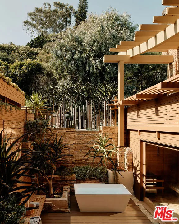 This architectural marvel features an intricate blend of vertical and horizontal planes of wood, stone, and metal, bathed in natural light streaming through sliding glass walls, strategically placed skylights, and an artistic glass floor. Designed by architect Jay Vanos, the finest woodworkers used American Southern cypress for its durability and golden hue on the floors and walls, complemented by a soaring wave redwood ceiling. With ocean views from almost every room, the home boasts a great room with a fireplace, a sitting/dining area, a gourmet kitchen with high-end appliances, and glass walls that open to an outdoor deck perfect for intimate or lavish entertaining. It includes three spacious master suites with fireplaces, luxurious spa-like baths, large closets, and ocean view decks, along with two additional bedrooms. Additional spaces include a sun-filled office/den, a cozy reading/library area, an art studio, an indoor sauna, a zen-style wellness area with sauna and cold plunge, and more. Steps lead to a lower-level surfboard storage area and provide direct access to the beach and renowned Latigo surf spot, making it an ideal home for surfing enthusiasts.