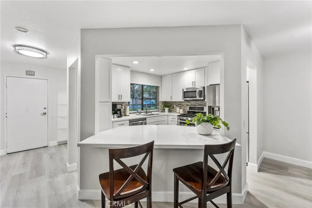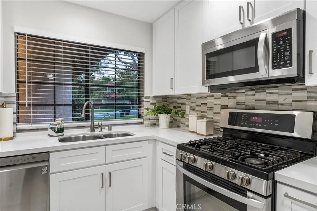 Gorgeous 2 story townhouse with TWO PRIMARY SUITES in the heart of Placentia * BRAND NEW KITCHEN with white shaker cabinets, extra storage in island/breakfast bar, glass tile backsplash, stainless steel appliances including range, built in microwave, dishwasher and stainless sink.