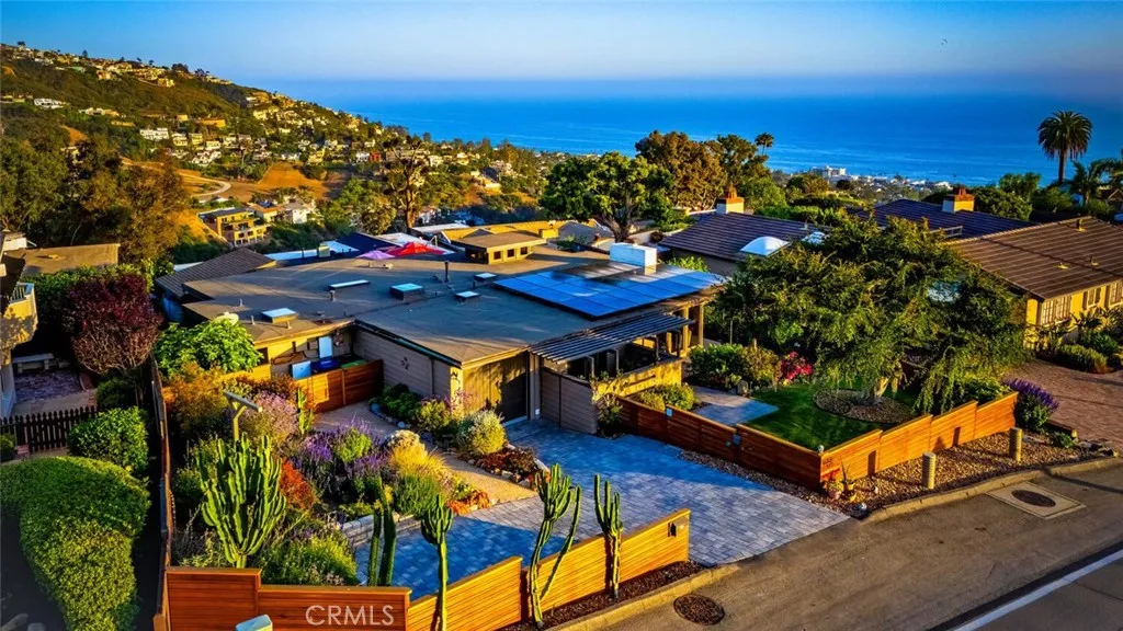 Perched above the pristine coves of laguna beach, this mid century modern masterpiece echoes the timeless influence of early Frank Loyd Wright design. With iconic post-and-beam construction and dramatic walls of glass, the home is thoughtfully positioned to capture sweeping ocean and canyon vistas from every angle. This single level, two bedroom two bath retreat has been beautifully remodeled to blend classic architecture with modern comforts. New floor to ceiling windows and elevated skylights flood the space with natural light, while lush landscaping and panoramic views create a seamless indoor outdoor living experience. Set on nearly 10,000 square feet of flat, useable land, the home offers privacy, serenity, and room to grow-complete with architectural plans included in the sale and potential for an ADU. Inside, a chef's ocean view kitchen flows effortlessly into the open plan living and dining rooms, grounded by rich wood flooring, and elegant stone surfaces throughout. Step outside onto the expansive wrap around deck, where a gentle breeze and post card worthy sunsets await. Cozy up by the wood burning fireplace as day turns into night and the coastline begins to glow. Whether you're seeking a peaceful retreat, an entertainer's dream, or a foundation for future expansion, this one of a kind architectural jewel delivers it all. UNIQUE HIGHLIGHTS INCLUDE; * PANORAMIC OCEAN VIEWS BOTH SOUTH FACING AND NORTHERN COASTLINE CAPTURING THE SUNSET. * EXPANSIVE CANYON AND HILLSIDE VIEWS. * OFFICIAL "VIEW PRESERVATION" DOCUMENTED THROUGH THE CITY OF LAGUNA BEACH TO PROTECT THE SPECTACULAR VIEWS. * SINGLE LEVEL HOME ON A RARE, FLAT, NEARLY 10,000 SQ FT USABLE LOT WITH INCREDIBLE POTENTIAL FOR EXPANSION.