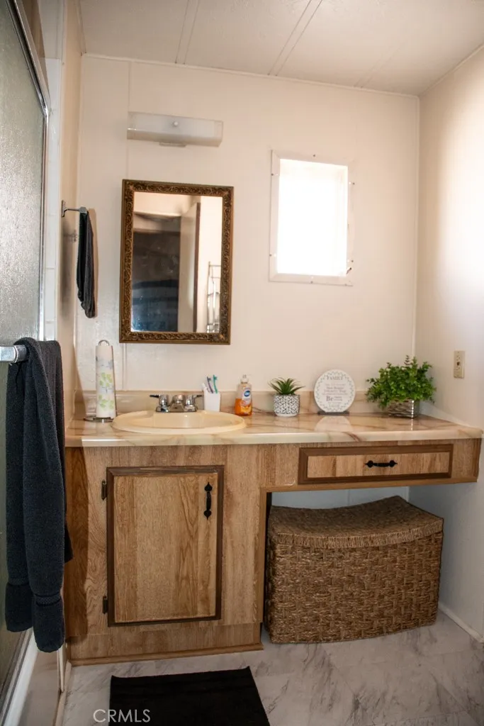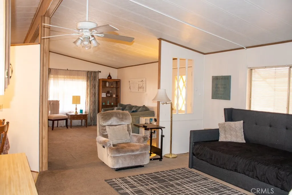 This home in the 55+ community of Banning Estates is ready for its new owner, with a PERMANENT FOUNDATION, OWNED SOLAR, and NO SPACE RENT (you own the land!). Upon entering the home, you'll be greeted with a spacious formal living/dining room with a built in hutch and wide windows for ample light. The area opens to a family room/den/tv room which adjacent to the kitchen, which features a pantry, plenty of counter and cupboard space, and room for a kitchen table. The laundry room is convenient to the living areas and features office/work/hobby space and access to the guest bathroom. The large primary bedroom with en suite features a soaking tub and stand alone shower, a vanity, and ample closet space. The 2nd bedroom rounds out the home and is perfect for guests, a care giver, or additional office/library/hobby space! Outside you'll enjoy a shady, low maintenance yard with a covered patio which is connected to the detached two car garage. Banning Estates offers the comfort of a 55+ neighborhood with a low (approx. $140/mo) HOA fee, a community pool, green spaces, and a clubhouse, as well as close proximity to local amenities, shopping, medical facilities, freeway access, and more! If you're in the market for an affordable home in a 55+ community, look no further than this well maintained home!