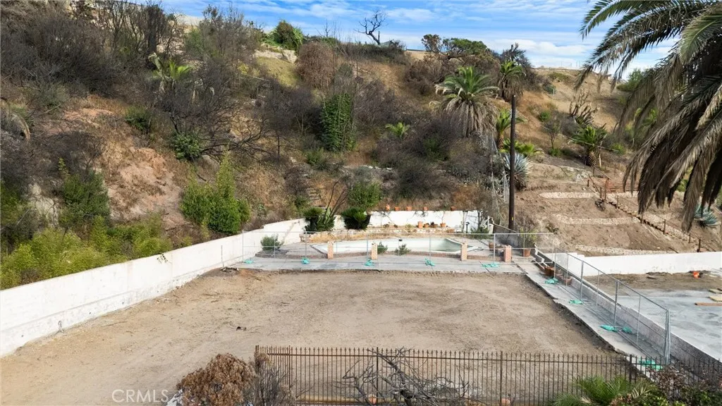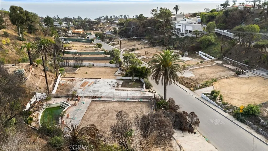 Discover this exceptional half-acre lot in Pacific Palisades, perfectly perched on its own level. This parcel offers unmatched seclusion and breathtaking Catalina views on a clear day, as well as full ocean views from many areas and rooms. Fully certified completion of Phases 1 and 2 by the Army Corps of Engineers. Spanning nearly 24,000 square feet, the lot is ideal for a large home with expansive outdoor living areas, including patios and landscaped gardens. The existing former footprint is approximately 3,000 square feet, allowing for up to 6,000 square feet on two levels. The gently sloping hillside is highly accessible, featuring established trails that lead to a scenic hilltop vista and tranquil rest spot. Additionally, there is potential to extend the build area into the hillside, providing unique opportunities for creative design and functional use of the terrain. A sizable mid-century modern pool remains on-site, awaiting refinement to become a stunning outdoor centerpiece. Situated just moments from the future and newly reconstructed Marquez School, the property offers convenient access to scenic walking trails, panoramic vistas, and outdoor recreation. Elevated above street level, the parcel ensures complete privacy, with no neighboring properties on either side, making it an ideal blank canvas to realize your dream home in one of the most prestigious neighborhoods in Pacific Palisades.