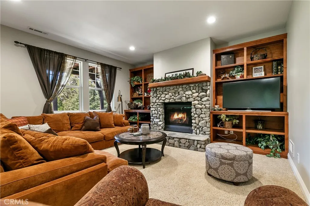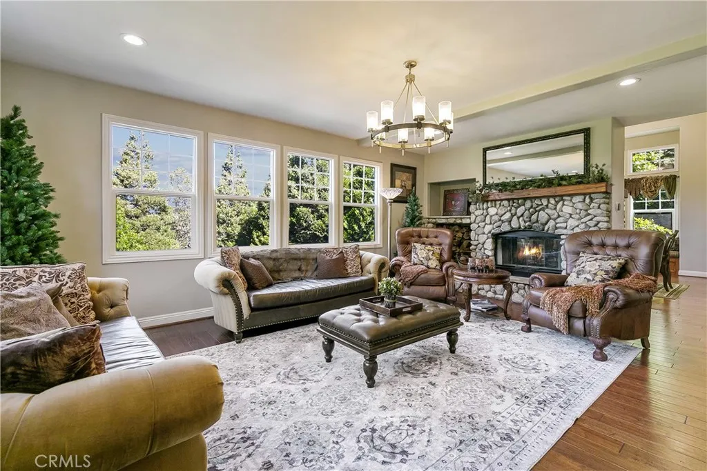 Welcome to 28449 Fresh Spring Lane in the exclusive gated Arrowhead Canyon Estates. This mountain retreat blends timeless charm with modern comforts, offering the perfect escape for year-round living or a weekend getaway. Step inside to find gleaming hardwood floors and a stunning dual-sided fireplace that creates an inviting ambiance between the living room and formal dining area. The open-concept gourmet kitchen is a true entertainer’s dream, featuring stainless steel appliances, custom cabinetry, and granite countertops—ideal for hosting family and friends or enjoying quiet evenings at home. Expansive windows on both the main and upper levels frame breathtaking views of the sparkling lake and lush forest. Upstairs, the serene primary suite retreat boasts vaulted ceilings, a private deck, a cozy fireplace, and a luxurious ensuite bathroom, making it the ultimate personal haven. Two additional spacious guest bedrooms share a stylishly appointed bathroom, offering plenty of room for loved ones. The lower level is designed for comfort and fun, with a private bedroom and bath, a spacious family room with its own fireplace, and direct access to a large deck. Tucked away is a hidden gem—a secret wine cellar and bar with an electric fireplace and space for a game table—perfect for entertaining or relaxing after a day on the lake. Outdoor living is effortless with expansive decks and peaceful surroundings that invite you to breathe in the crisp mountain air or host unforgettable gatherings. Located just moments from Arrowhead Village, you’re close to shops, restaurants, the marina, pickleball courts, a dog park, and more—all within two miles. And best of all, this home includes lake rights, offering endless opportunities for outdoor adventures on the water. Your dream mountain retreat is waiting—schedule your private tour today. NOTE: The listing agent has a few dock listings for sale.