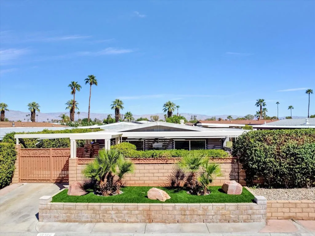 Welcome to desert living at its finest in this stunning 3-bedroom, 2-bathroom manufactured home spanning 1,560 square feet of thoughtfully designed space. This completely renovated treasure seamlessly blends indoor and outdoor entertainment with an open floor plan that flows effortlessly throughout. The heart of this home features a spectacular granite island that's practically begging for your next dinner party or casual morning coffee. Whether you're whipping up a feast or just need extra workspace, this kitchen centerpiece delivers both style and functionality. A cozy fireplace offers warmth and ambiance to the living area, creating the perfect gathering spot for family and friends. The split floor plan offers ultimate privacy, with the luxurious primary bedroom featuring an immense walk-in closet and an impressive tile shower that transforms your daily routine into a spa-like experience. Two ADDITIONAL bedrooms PLUS a dedicated office space provide flexibility for work-from-home needs, guests, or hobby rooms. Storage enthusiasts will appreciate the abundant built-in storage solutions throughout the home. Double-pane windows ensure year-round comfort while maintaining energy efficiency. Step outside to your private oasis featuring a gorgeous Pebble Tec saltwater pool and spa with elegant water features. Retractable sun blinds provide customizable shade, while an outdoor shower adds convenience for post-swim refreshing. The extremely private outdoor space is perfectly designed for entertaining, from intimate gatherings to larger celebrations. There's even a soft water filtration system that is owned. Located near renowned Eisenhower Health and the upscale El Paseo Shopping District, you'll enjoy convenient access to world-class medical care, dining, and retail therapy whenever the mood strikes. Living in this wonderful community means enjoying low homeowners' association dues that surprisingly cover FREE golf, free internet and trash pickup, a clubhouse with a restaurant, a lounge, 18-hole executive golf course and pro shop, three community pools, hot tubs and an exercise room. Add a billiard room, card room, indoor shuffle board, tennis courts, pickle ball courts, library, recreation room, and many active clubs to realize all that PDGCC offers for your perfect desert home. With a variety of activities, every day can be as active or relaxed as you desire. This incredible home won't last long! Please call for a showing.