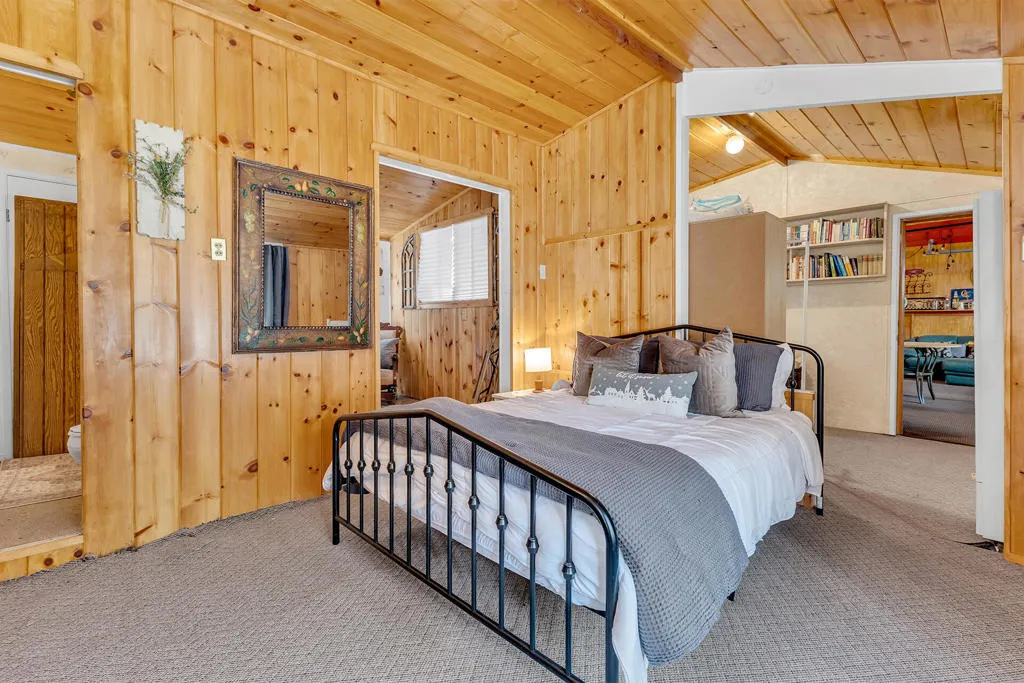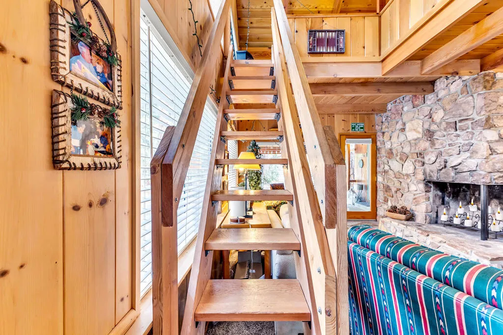 ROOMY MODIFIED A-FRAME RETREAT Discover the perfect blend of rustic charm and spacious comfort in this charming modified A-frame mountain home. Featuring a dramatic great room with open beam ceiling, rich natural wood paneling, expansive picture windows and large rock fireplace, this home exudes warmth and character from the moment you step inside. Ideal for entertaining, the open-concept layout includes a spacious dining and family room with a second rock fireplace and beamed ceiling, creating a cozy, inviting atmosphere for gatherings of any size. The centrally located kitchen is designed for function and flow, offering easy access to both living areas - perfect for hosting friends and family. The main-level primary bedroom offers convenience and privacy, while two oversized loft-style bedrooms upstairs provide multiple sleeping options or flexible space for work and play. A full bath on the main floor adds to the home's practicality. The level lot has ample parking - including space for an RV - and room for outdoor recreation. The detached two-car garage, currently used as a game room, has an adjoining guest quarters with bath and laundry room. Located on a snow plowed road. Selling partially furnished.