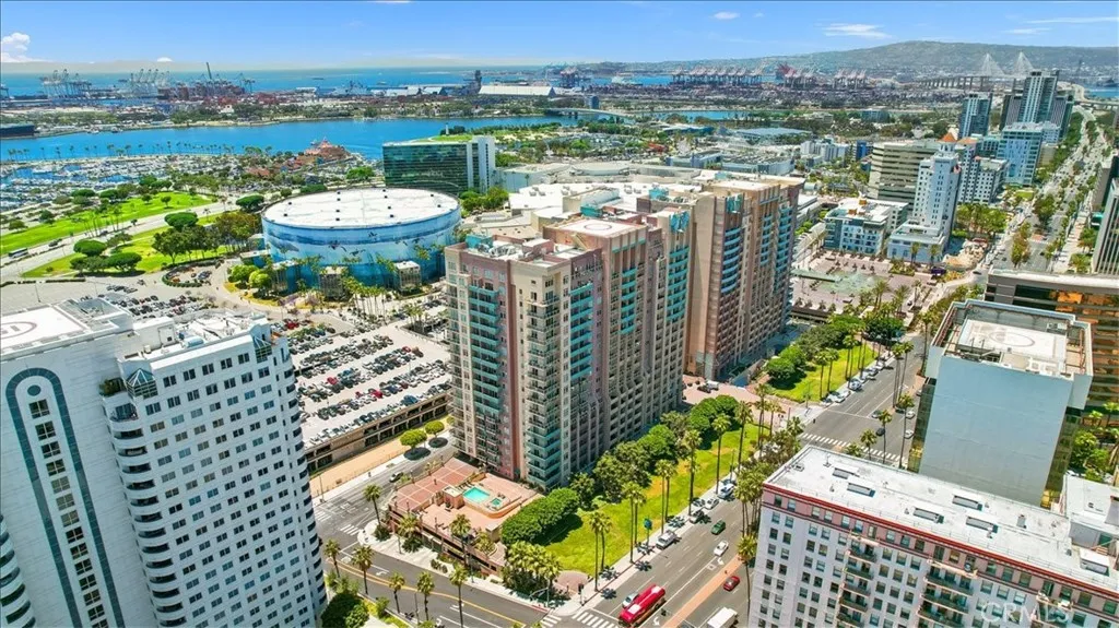 Welcome to Unit 708 at 488 Ocean Boulevard, offering expansive open-air ocean views of the Pacific. This beautifully maintained condo features 10-foot ceilings and hardwood flooring throughout the living room and both bedrooms, creating a bright and open living space. The kitchen is appointed with granite countertops, slate tile flooring, ample cabinetry, and includes all appliances. An in-unit laundry room offers a full-size washer and dryer. Both bedrooms include walk-in closets, with the primary bedroom featuring an en-suite bathroom. The home is equipped with central air conditioning and heating for year-round comfort. Enjoy ocean and city views from the living room, bedrooms, and two private balconies. The unit includes one assigned parking space in a secure, gated underground garage. HOA amenities include water, 24/7 security and concierge services, fitness center, sauna, club room, business center, and high-speed internet through Frontier. Located just steps from the beach, coastal bike paths, Metro transit, dining, shopping, and entertainment venues including Shoreline Village, The Pike Outlets, Terrace Theater, and downtown Long Beach attractions. During April, balconies offer great views of the annual Long Beach Grand Prix.