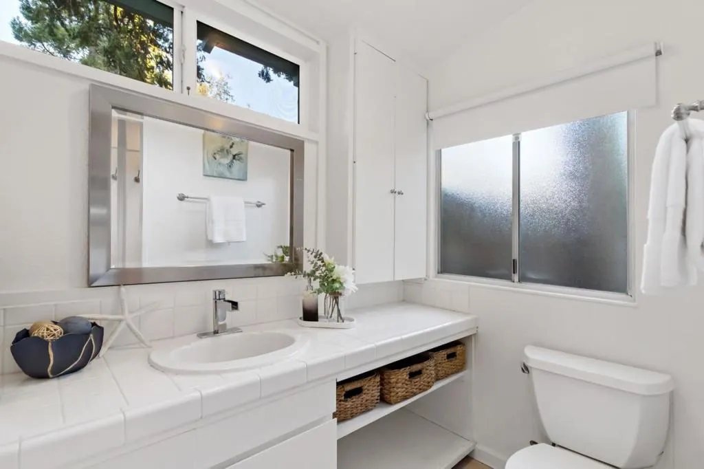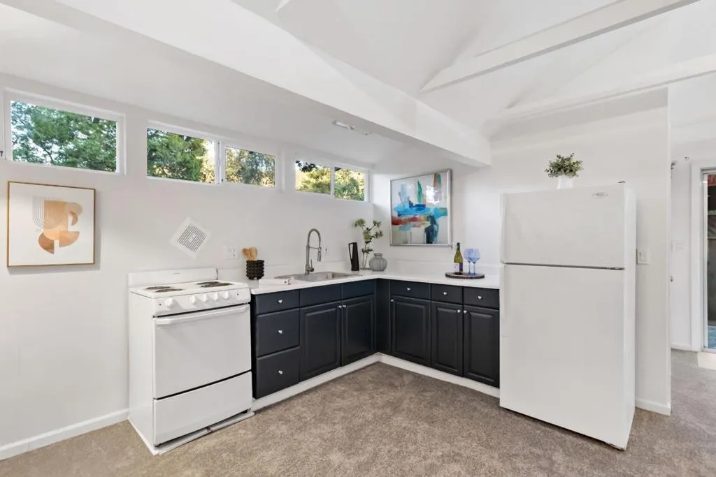 Discover the perfect blend of nature and modern convenience at 1019 Los Trancos Road in the peaceful Los Trancos Woods neighborhood. This charming home, built in 1930, offers 1,770 SF of versatile living space (per the Seller) in two buildings with freshly painted exteriors. The 1,225 SF main house features three bedrooms and two baths, with vaulted ceilings and skylights that invite abundant natural light. The airy living room, featuring exposed beams, seamlessly transitions to a large deck and patio, ideal for indoor-outdoor entertainment. The galley kitchen is a chef's delight, featuring stainless steel appliances and ample cabinetry that overlooks the garden. A 545 SF studio is situated behind the one-car garage. While not reflected in the County records, the studio is a flexible space with a kitchen, stacked washer/dryer, full bathroom, new wall-to-wall carpeting, and a private deck - ideal for multi-generational living, working from home, or generating rental income. Positioned on a generous 9,360 SF parcel, you'll enjoy peaceful views and easy access to Portola Valley's lively Town Center and Highway 280 for easy commuting.