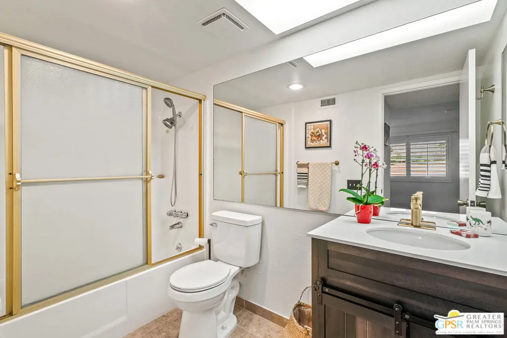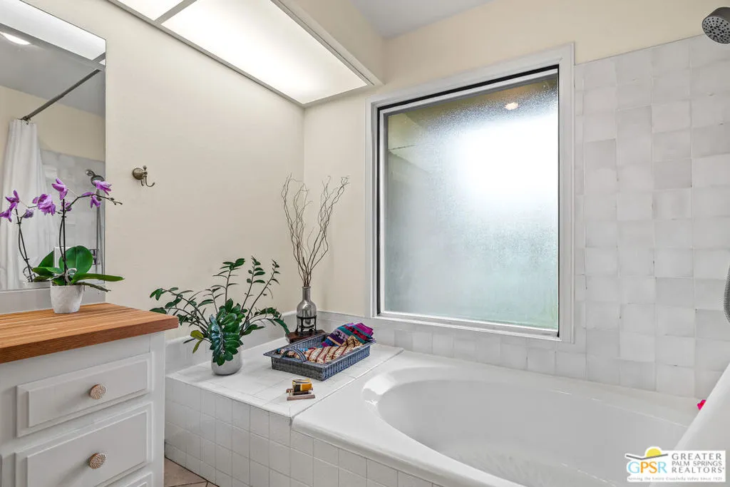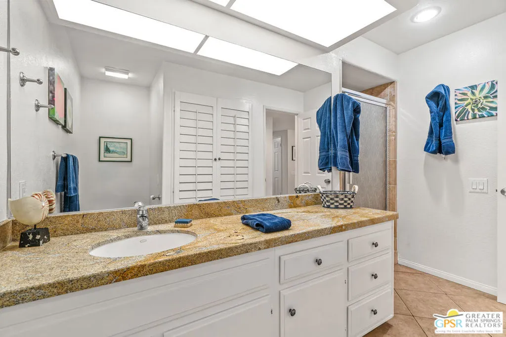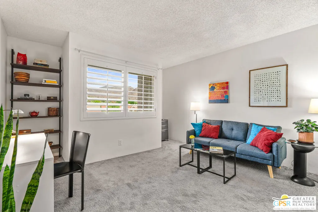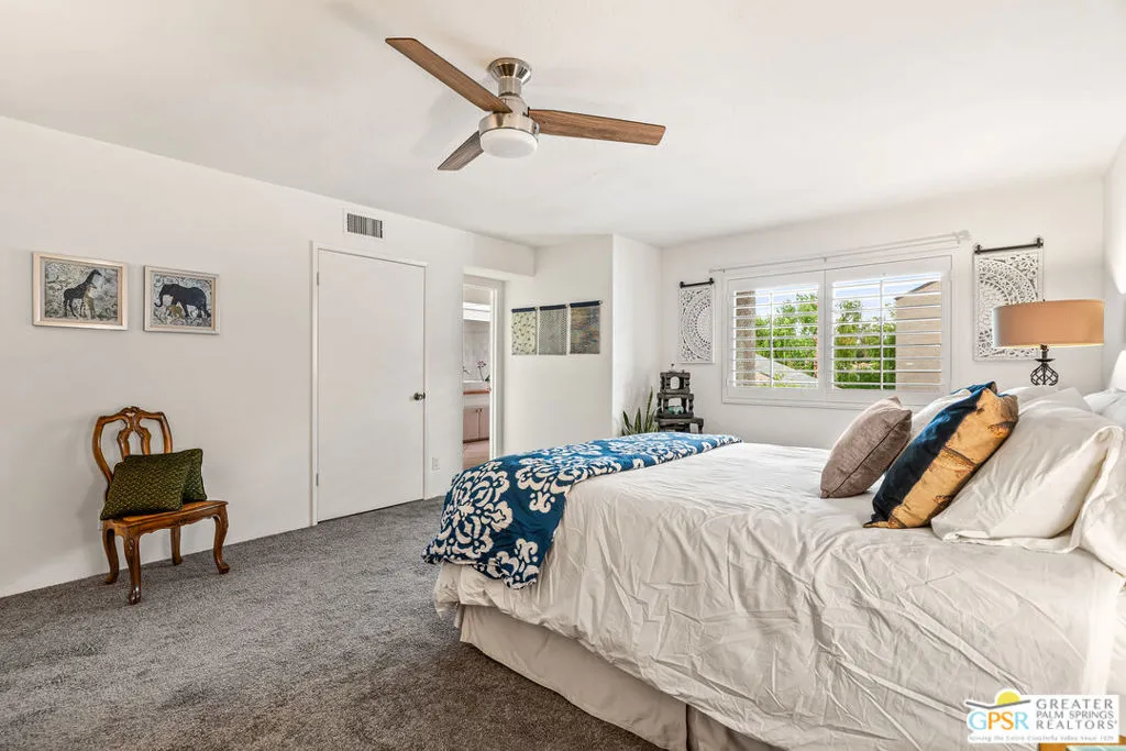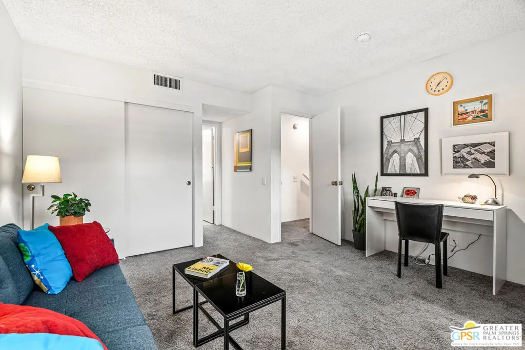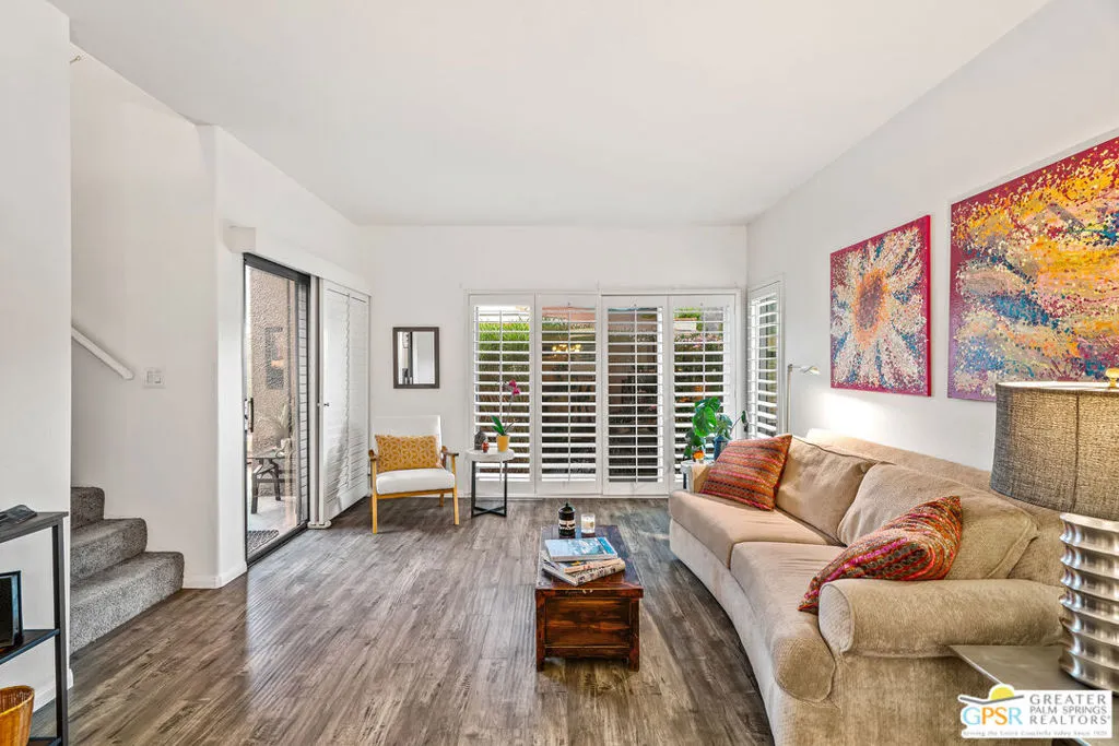 Offered turnkey furnished, this 3BR/3BA condo in the heart of Rancho Mirage, provides the perfect blend of spaciousness, convenience, and style in an absolutely ideal location. Smartly nestled into a quiet locale within the parklike setting of Desert Village, you'll find a well-thought-out floor plan with the living areas, formal entry, one bedroom and one bath downstairs on the main floor. To create privacy and an ample sense of separation, the generously-sized primary suite is located upstairs, with sufficient floor space to create a sitting area, or to graciously accommodate other options for work or relaxation. The adjoining ensuite primary bath is also amply proportioned with large double vanity, and luxurious soaking tub. A second ensuite bedroom (and bath) upstairs offers the perfect opportunity for a comfortable guest suite or home office, with mountain views and a large south-facing window. The kitchen is updated with a stylish stone countertop, tasteful warm-tone natural wood cabinets providing oodles of storage, and a stackable washer and dryer tucked away in a closet. By providing a few steps down into the living room from the kitchen and dining area, the architect created a dynamic flow of open spaces, creating higher ceilings in the living room for a greater sense of spaciousness. Adding to that sense of spaciousness, a large glass slider leads to a private south-facing patio, in essence an adjacent outdoor room, with plenty of winter sunshine. The patio is secured by an attractive solid gate for easy access to nearby assigned parking. In addition, the pool is just steps away, and easily accessible either from the patio or the front door. Plantation shutters are used throughout for comfort, privacy, sun control and, more importantly, a sophisticated sense of style. The community features lush landscaping, a thoughtful array of plantings and a small grassy oasis at the west edge of the community which serves as perfect picnic spot or dog walking area. Desert Village is just minutes from shopping, dining, and everyday services, including Whole Foods, Trader Joes, Target, REI, Barnes and Noble, Bristol Farms, Planet Fitness, The Palm Desert Aquatic Center, and many dining options, both casual and fine. The Eisenhower Hospital Campus is also just a short distance away, as are designated bike routes and popular hiking trails. Come discover 71824 Eleanora Ln in Desert Village, a small "villa" enclave in the heart of Rancho Mirage surrounded by desert beauty and urban amenities.