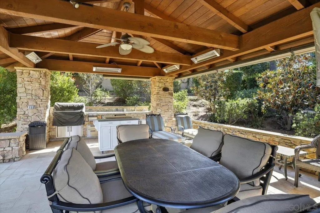 Welcome to this remolded sanctuary of sophistication in West Escondido. This gated estate blends timeless design with modern luxury, offering a lifestyle of serenity, beauty, and effortless entertaining. From the moment you arrive, the circular driveway and lush gardens set a gracious tone. Beveled glass doors open to a sunlit interior where vaulted ceilings and travertine floors lead to a living room anchored by a dramatic stone fireplace and panoramic views of nature. Designed for gatherings, and fun... See Supplement A circular drive leads to a stunning entry framed by lush landscaping and beveled glass doors. Inside, vaulted ceilings, travertine floors, and a dramatic stone fireplace define the living room. The formal dining room opens to the pool via folding glass doors and features custom built-ins. The kitchen includes a butcher block island, Miele coffee station, breakfast nook, pantry, and pass-through window to the patio. Adjacent is a spacious laundry room with ample cabinetry. The home offers 5 bedrooms, including a luxurious owner’s suite with walk-in closet, spa-like bath, and an attached office with built-ins. Outdoor amenities include a 38’ lap pool, raised spa, fire-and-ice features, private cabana, putting green with sand trap, and a 23x19 ft gazebo with granite counters, BBQ, heaters, fans, and TV. Fruit trees, rose garden, scenic walkway, and night lighting complete the resort-style grounds. Epoxy-floored garage with LED lighting and storage. A rare opportunity for refined living. The kitchen is both warm and functional, with a butcher block island, Miele coffee station, breakfast nook, and pass-through window to the patio. A spacious laundry room adds everyday ease. The owner’s suite is a retreat unto itself, with a spa-inspired bath, walk-in closet, and an adjoining office with granite counters and built-ins. Three additional bedrooms offer comfort and privacy. Outside, the grounds unfold like a private resort: lap pool, raised spa, fire-and-ice features, putting green, cabana, and a fully equipped gazebo with scenic walkway. Fruit trees, a rose garden, and curated lighting complete the ambiance. This is more than a home—it’s a destination.