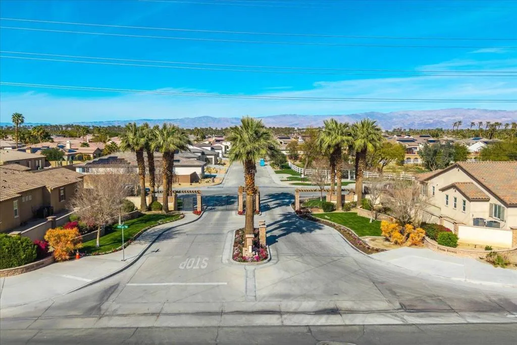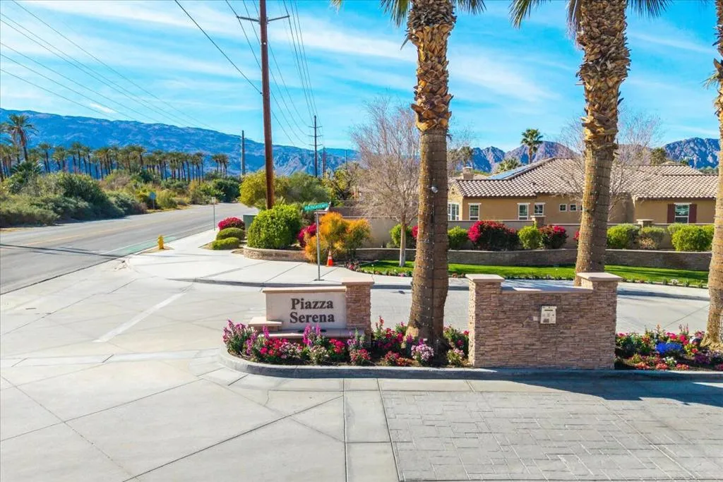 Highly desirable Pinecrest model located behind the gated community of Piazza Serena. Amenities include an expansive great room situated off the gourmet kitchen that includes stainless steel appliances, oversized island and walk in pantry, a spacious dining room, upgraded/custom recessed lighting, ceiling fans and blinds throughout, plus a quiet study/den and media/work center off the kitchen area. The elegant primary suite offers large dual walk-in closets, separate upgraded shower and bath for your convenience. You'll also appreciate a convenient laundry and powder rooms, two additional bedrooms located on the opposite side of the primary bedroom. South facing backyard with views of the Santa Rosa mountains include a nice covered patio. Additional upgrades include paid solar panels, tank less water heater, various electric outlets for electric appliances including electric outlet for an electric vehicle in the one of the 3 car garages along with many upgrades to name.