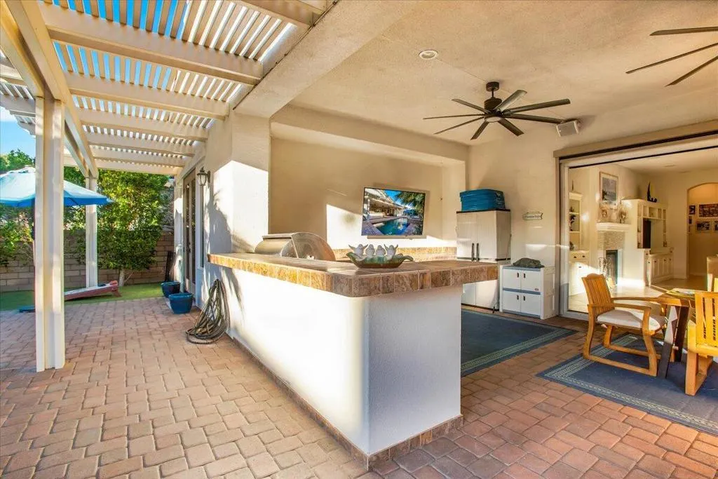 **Your Dream Home Awaits!** Explore Santerra, an exclusive enclave of just 28 homes, ideally positioned between majestic mountains and top-tier golf courses in the charming city of La Quinta. This exquisite 'Desert Retreat' home features 3 bedrooms, 3.5 bathrooms, and 2 flexible bonus rooms, perfect for conversion into extra bedrooms.Picture yourself in a bright and airy Great Room, where a cozy fireplace and a retractable glass wall create a seamless transition to an impressive backyard oasis. Dive into the Pebble Tech Salt Water pool and spa, or fire up the built-in BBQ as you bask in the California sunshine - true indoor-outdoor desert living at its finest.This chef-worthy kitchen boasts an over-sized island, stunning quartz counter-tops, and all-newer appliances, making it the ideal setting for hosting family and guests.The two additional bonus rooms are currently utilized as an office and a sitting room. The primary suite is an oasis of tranquility, with French doors leading to the pool/spa and BBQ area, an expansive walk-in closet, and a luxurious shower designed for two.Other notable upgrades include meticulously landscaped grounds, exterior lighting and irrigation, water softener hookups, fresh interior and exterior paint, plantation shutters throughout, a newer hot water heater, a new courtyard door and concrete patio, a recently installed A/C unit, commercial misters, and much more.This exceptional property is a must-see for anyone seeking the perfect desert escape. Don't miss your chance to make it your own!