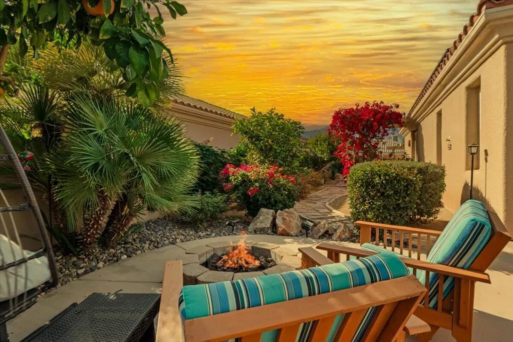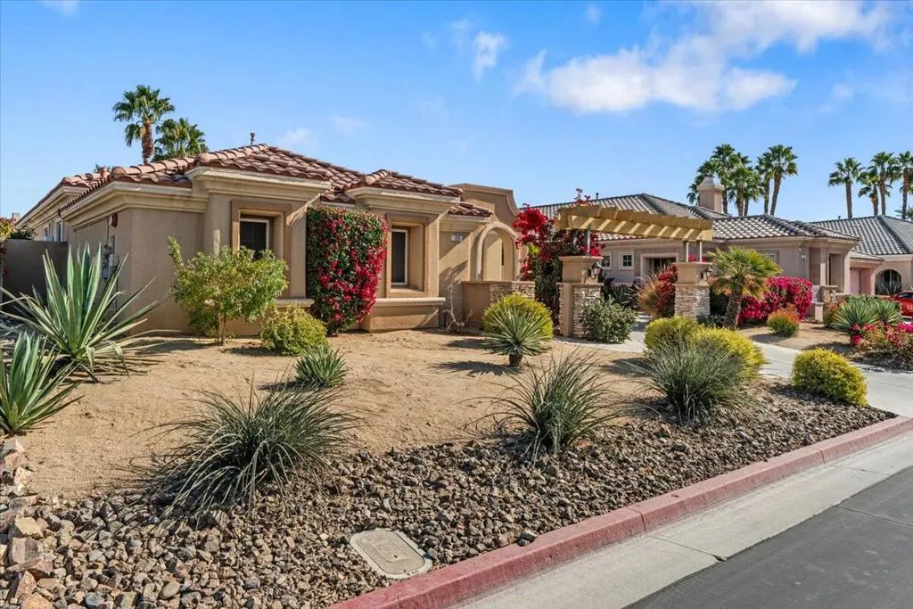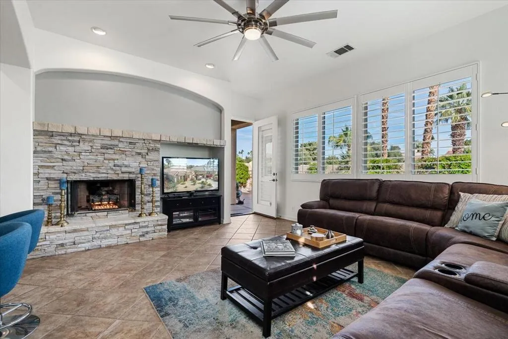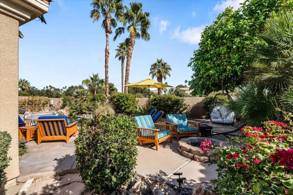 Discover VISTA MIRAGE, a tranquil gated community situated in the beautiful Rancho Mirage. This is an extraordinary opportunity for discerning buyers seeking exceptional value in their next home. This exquisite residence features 3 generously sized bedrooms and 2 contemporary baths. The welcoming family room is enhanced by a charming fireplace, while the updated kitchen boasts beautiful quartz countertops, stainless steel appliances, and a brand new refrigerator. Both bathrooms have been tastefully modernized, with the primary bath now showcasing a stylish closed shower door. Throughout the home, elegant tile floors and plantation shutters add an air of sophistication. Step outside to relax in your private oasis, featuring a pebble tech pool and spa, along with a fire pit that's ideal for entertaining on cool evenings. The outdoor space is enhanced by new patio furniture, providing a stylish and comfortable setting for gatherings. Additional highlights include a 2-car attached garage and low HOA dues. Recent upgrades feature attractive desert landscaping and a solar lease that the buyer must assume, with 7 years remaining. Electric bill is $270 per month. As a bonus, this home is offered furnished (per inventory), making it an ideal choice for either full-time living or a seasonal getaway. Don't miss out on this exceptional opportunity--call today to schedule your private showing!
