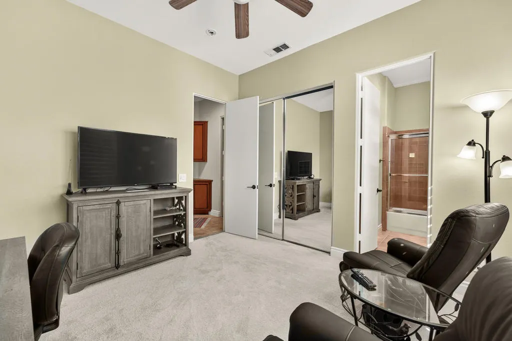 Four bedrooms, all ensuite plus a powder room. 10' & 12' ceilings throughout. It features an ideal bedroom layout: the primary suite is on one side of the home, providing great separation from the three additional guest bedrooms on the other side, each with its own ensuite bathroom. A powder room is available for guests. All in nearly 3,000 square feet, many exterior updates, interior in A+ condition also with various updates, definitively in move-in condition. Views? YES, great southern mountain views from many positions both inside and out, starting with the charming courtyard at the entry, to the back where property sits higher than those on the pool side so there are expansive vistas and real privacy with Mt. San Jacinto as a backdrop. Sits at the top of a cul-de-sac in one of the few enclaves inside IWCC that has real live children and people under 60 (no offense to my compadres with whom I share this demographic). The yard space is great for kids and dogs and even those a bit older will find it relaxing, perfect for entertaining and most importantly, naps. Landscaping is especially low maintenance, all grass is turf, bushes and trees require infrequent trimming.Come see it, you will be glad that you did, time well spent.