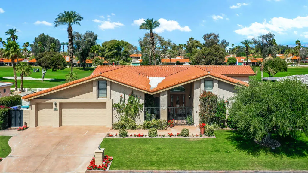 Custom golf course home on one of the best streets in Bermuda Dunes!! This unique property has TWO PRIMARY SUITES plus a third bedroom!! Each suite has a full bathroom and direct access to an inviting inground spa located in an elegant, very private courtyard setting. The other bedroom is currently used as an office with built-ins. Enter through custom lead glass door into a open great room concept with a cozy fireplace and spacious sit down wet bar - all with plenty of glass to let in tons of light. The gourmet kitchen has been thoughtfully remodeled and has a convenient morning room for casual dining - all with great views of the golf course and mountains. There is plenty of room for entertaining with the sparkling pool on one side of the home and an expansive covered patio on the north side of the home, as well as the separate private garden area with the in ground spa. The great room boasts a cozy fireplace for those cooler evenings and a spacious sit down bar with step down area to storage and a refrigerator. There is also a fireplace in one of the primary suites!! Two car attached garage with a golf cart garage and plenty of storage completes the package. IID for lower electric. Low HOA of only $214 a month includes cable TV with two boxes with Showtime, Cinemax & HBO plus internet with Spectrum PLUS 24-hour guard gated security. 30 day rental minimum.