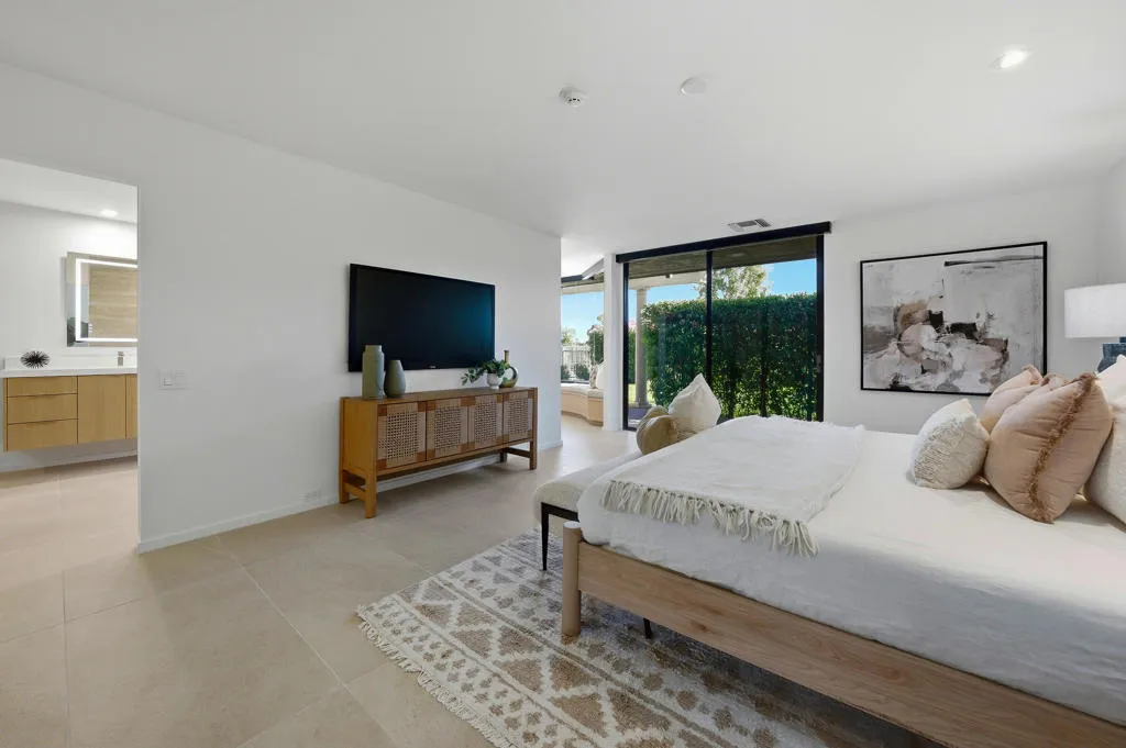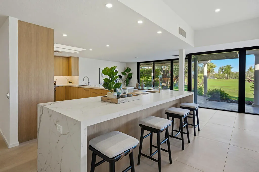 Experience elevated desert living in this stunning 3-bedroom, 3-bathroom, lakefront residence showcasing panoramic south and southwest views across the 1st and 2nd double fairways. Thoughtfully expanded and extensively remodeled in August 2025. The Shaughnessy floor plan has been transformed into a modern masterpiece where sophisticated design meets effortless indoor-outdoor living. A wall of glass wraps the morning room, kitchen, and living area, framing serene water and golf course vistas while flooding the home with natural light. The open-concept living space features 24''x48'' porcelain tile flooring throughout, a striking split-face concrete slab fireplace, and seamless transitions to the expansive outdoor patio--ideal for relaxing or entertaining against a breathtaking backdrop. The chef's kitchen is a true showpiece, boasting waterfall quartz countertops, custom soft-close cabinetry, and top-of-the-line KitchenAid appliances. Every detail was curated with luxury and functionality in mind, offering both a refined aesthetic and exceptional performance. Automatic Blinds are installed throughout the home. Each of the three spacious bedrooms offers comfort and privacy, with beautifully updated en-suite baths showcasing designer finishes and modern fixtures. The primary suite captures tranquil lake views and exudes understated elegance, while guest suites provide the perfect retreat for family and friends. Additional upgrades include two newer HVAC systems (installed 2 years ago), all-new ductwork, and a four-foot expansion off the living room, enhancing both comfort and livability. Perfectly positioned to capture morning light and glowing sunset skies, this home offers the best of golf course and waterfront living in one exquisite setting. Every inch reflects thoughtful craftsmanship and contemporary luxury--making this residence truly one of a kind. The Springs, it's where you belong!