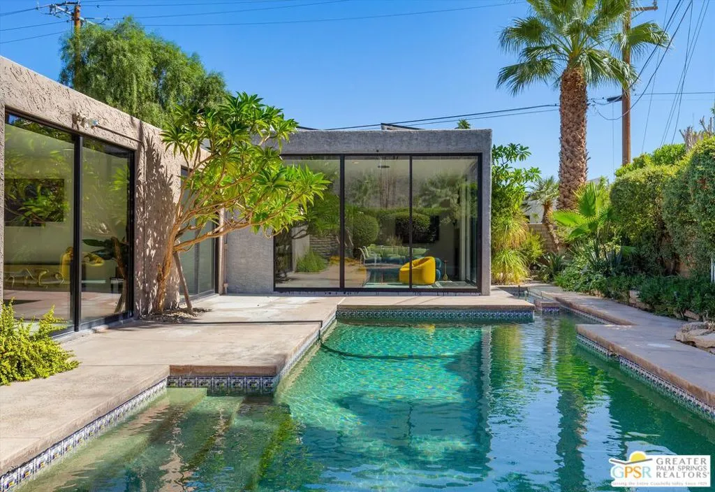 Located in the coveted Deepwell Estates neighborhood, this late-modern architectural home built in 1974 captures the essence of desert modernism with its sleek lines and commanding mountain views from both inside and out. Deepwell's location in the desirable south end of Palm Springs offers a unique blend of tranquility, walkability, and proximity to some of the city's best restaurants, midcentury landmarks, and resort amenities. Enter through a custom commercial glass door into a spacious living room with 10-foot Fleetwood floor-to-ceiling glass walls that open to a south and west-facing backyard; a seamless extension of the interior space and a perfect frame for dramatic sunsets. The kitchen features abundant cabinetry, generous counter space, and a casual breakfast area conveniently situated behind the main living and dining rooms. Recently renovated bathrooms bring a sophisticated, contemporary touch that integrates effortlessly with the home's original design. Currently set up as a 3 bedroom house, a 4th has been opened up and is used as a den or office but could be reconfigured back into another bedroom. One of the signature elements of this property is its dramatic ceiling height in the main living area, creating a striking connection to the surrounding mountains a defining hallmark of late-modern Palm Springs architecture.