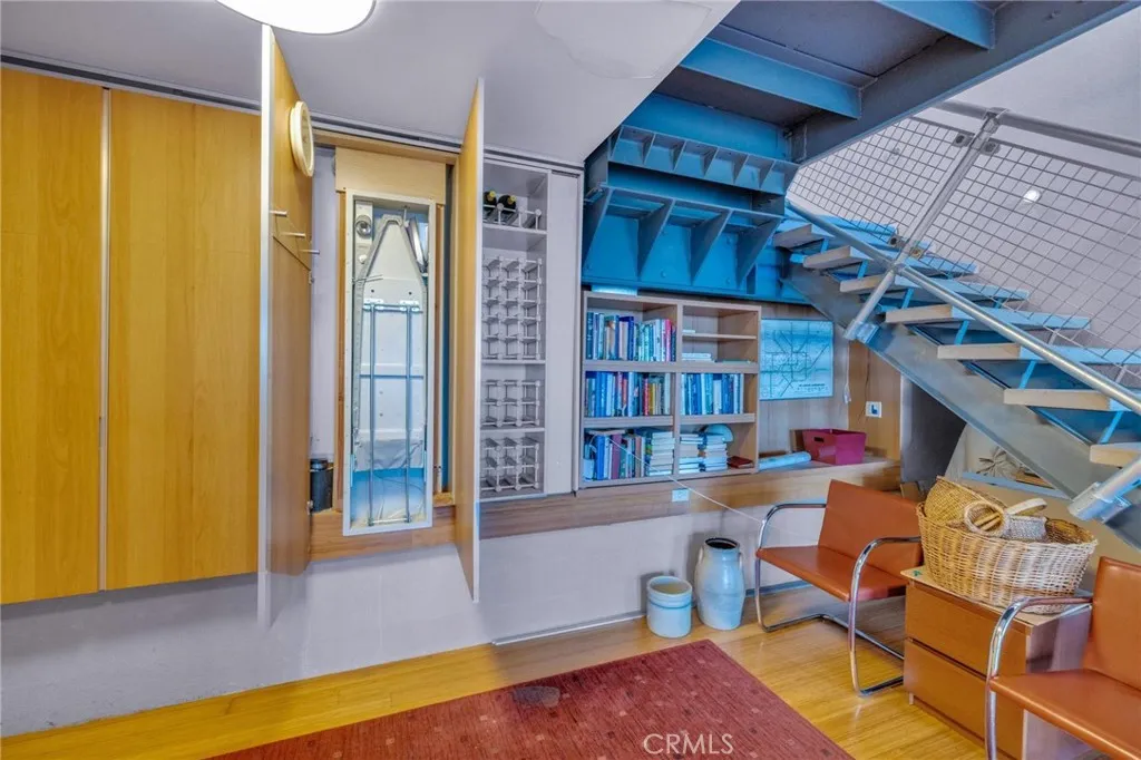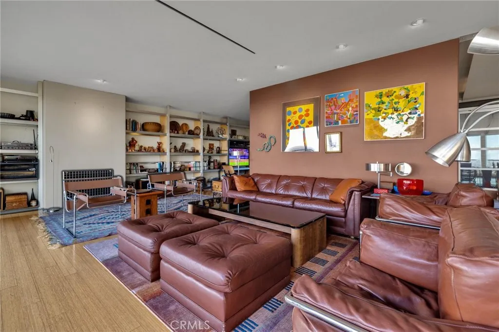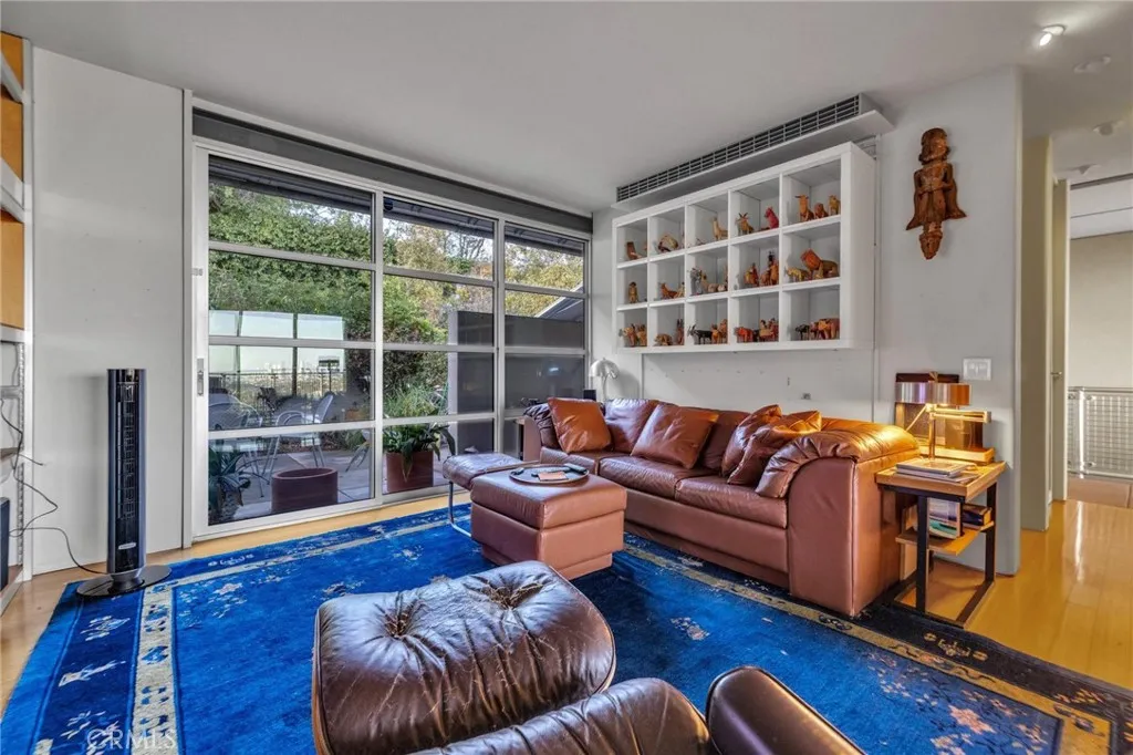 The main level features a spacious living room with bamboo flooring, designer air ducts, and custom built-ins. A sleek galley-style chef’s kitchen is outfitted with Sub-Zero, Miele, and Viking appliances, steel countertops, and an oversized custom spice rack—ideal for both entertaining and everyday living. The open-concept layout includes a den, powder room, and floor-to-ceiling windows for seamless indoor-outdoor ambiance.