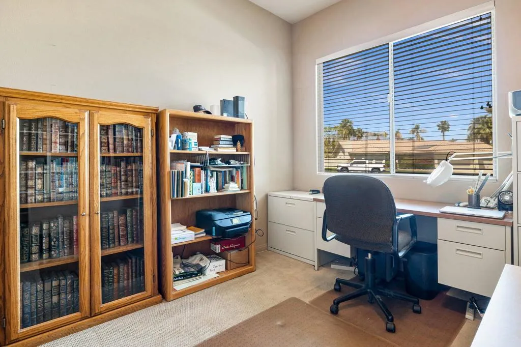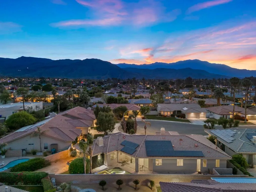 Exceptional 4-bedroom, 3.5-bath custom home located in the highly desirable central Palm Desert community of The Grove with beautiful mountain views. This well-designed residence offers an open-concept layout with 12-foot double sliding doors that create a seamless indoor/outdoor flow and showcase beautiful mountain views.The home features a spacious primary suite, a private en-suite bedroom, and two guest bedrooms, plus an additional powder room for convenience. The gourmet kitchen boasts custom cabinetry, granite countertops, premium appliances, and abundant storage throughout, including a large laundry room with extra cabinets. The main living area boast high cathedral ceilings! Enjoy desert living at its best with a private pool and spa, perfect for relaxing or entertaining. Additional highlights include 8-foot interior doors, energy-efficient solar system, and a 2 car garage with ample storage space.Located close to shopping, world class dining, world class golf, and top-rated schools this home combines quality craftsmanship, comfort, and an ideal Palm Desert location.