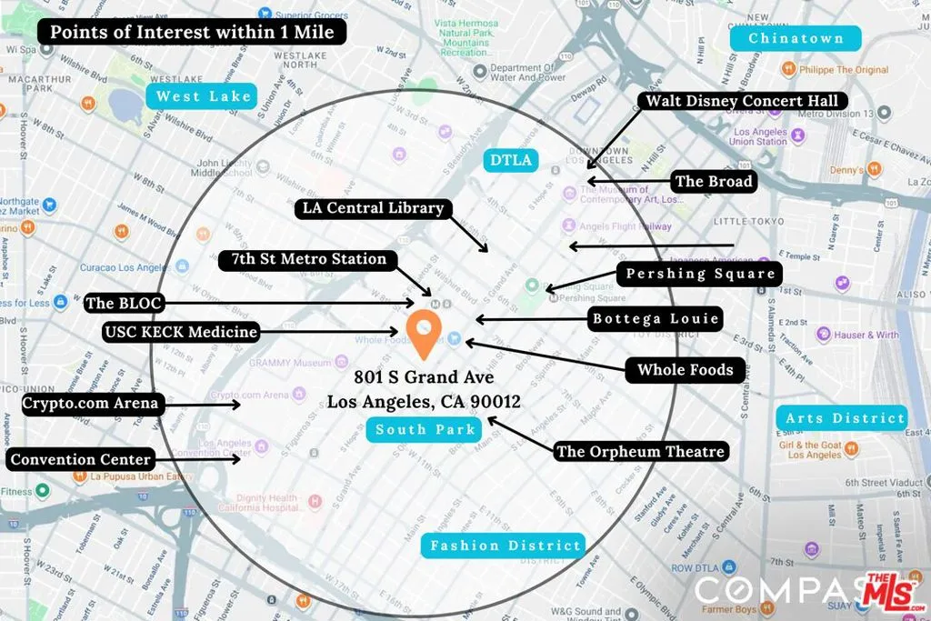 THE BEST PRICED UNIT CURRENTLY LISTED IN SKY LOFTS! PRICE IMPROVEMENT - $40,000! MOTIVATED SELLER! Sky Lofts is at the epicenter of DTLA in the South Park District. Perched high above the city on the 15th floor at 801 S Grand Ave, this 2-bedroom, 2-bathroom, 1,220 square foot loft-style condo offers a seamless blend of modern finishes, open-concept living, and exciting skyline views. This south facing unit has massive windows, letting natural light spill in to create an ideal backdrop for both day-to-day living and evening entertaining. 10 foot high ceilings add to the loft style vibes. The kitchen is open to the living room with a breakfast bar/island with plenty of storage and seating capability as well as a dining area between the kitchen and living room. Off of the living room there is primary bedroom suite with a spacious ensuite bathroom that includes a double vanity, a large tub and separate shower. Attached to the primary bathroom is a large walk-in closet. The 2nd bedroom, off the main entryway, is perfect as an office or guest bedroom and situated next to the 2nd full bathroom. There are light hardwood floors throughout the unit giving it a modern and bright tone. In addition, there is an in unit washer and dryer closet and central heat and air conditioning. The list of building amenities are impressive - a premium updated gym, a movie/media room with comfy theatre style seating, a clubhouse/entertainment room with a full kitchen that can be booked for events and a 24 hour security desk in the lobby. The unit includes two side by side parking spaces in the underground garage. There is a separate garage on site with ample visitor parking for guests. Nightlife, dining, entertainment and shopping are minutes away. Notable restaurants nearby like Bottega Louie, Water Grill, 71 Above and LeGrand. Across the street from Whole Foods and within 5 blocks from Crypto.com arena. Easy access to the USC campus and USC Keck. If you're looking for a downtown city lifestyle with a walkable neighborhood and vibrant culture, then 801 Grand Ave is the place to be.