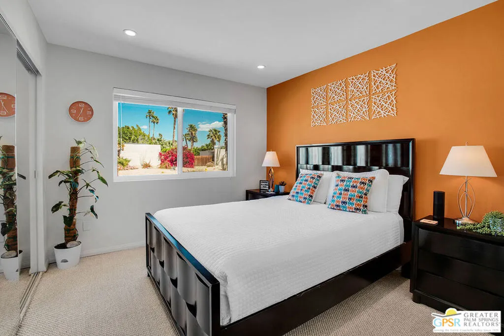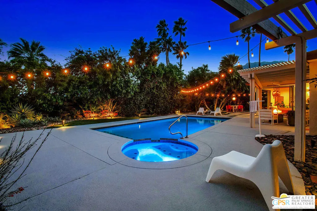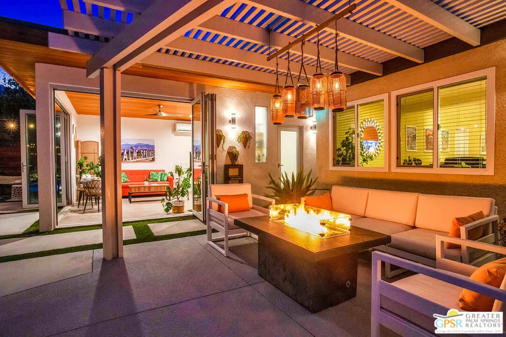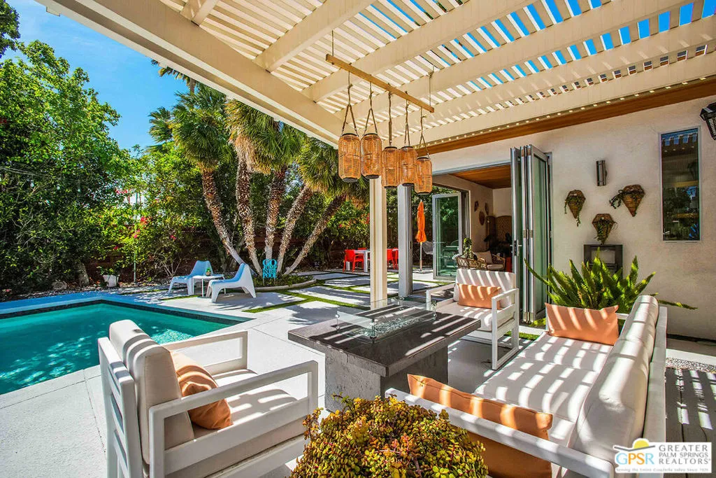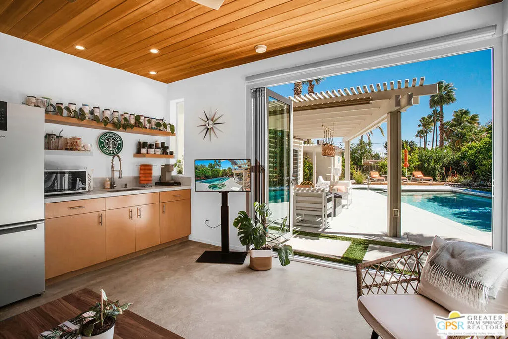 Experience the perfect blend of modern luxury and iconic design in this beautifully renovated and expanded 4-bedroom, 3-bathroom desert retreat originally crafted by acclaimed architect Hugh Kaptur. Offered fully furnished, this home is ideal as a stylish primary residence or a highly desirable vacation rental, especially with the addition of a charming detached casita completed in 2022. Inside, you'll immediately notice the exceptional craftsmanship and thoughtful finishes throughout. The open-concept great room is an entertainer's dream, featuring soaring ceilings, a cozy fireplace, and seamless flow between the spacious living area, dining space, and island kitchen with bar seating. The expansive primary suite is a true sanctuary, boasting a luxurious ensuite bathroom with dual vanities and a rain shower, plus a generous walk-in closet. Two additional bedrooms in the main house provide comfortable accommodations for guests or family. The recently added 300 sq ft casita elevates the resort-like atmosphere, featuring floor-to-ceiling glass doors that open to the lush yard and pool. Complete with its own full bathroom (with separate pool access) and a convenient kitchenette, the casita is the perfect hub for all your outdoor entertainment activities. Equipped with its own Eco air system, the casita can be incredibly versatile, also serving as an art studio, gym, or additional bedroom for guests or in-laws. Step outside to your private backyard paradise an inviting, updated saltwater pool and spa surrounded by mature landscaping and multiple lounging areas complete with fire table. This home is fully equipped with smart home technology, automated pool controls, a solar energy system, and EV charging, delivering energy efficiency and modern convenience. To explore the full list of upgrades and features, contact agent to schedule a private tour of this exceptional property or for a link to the virtual tour.