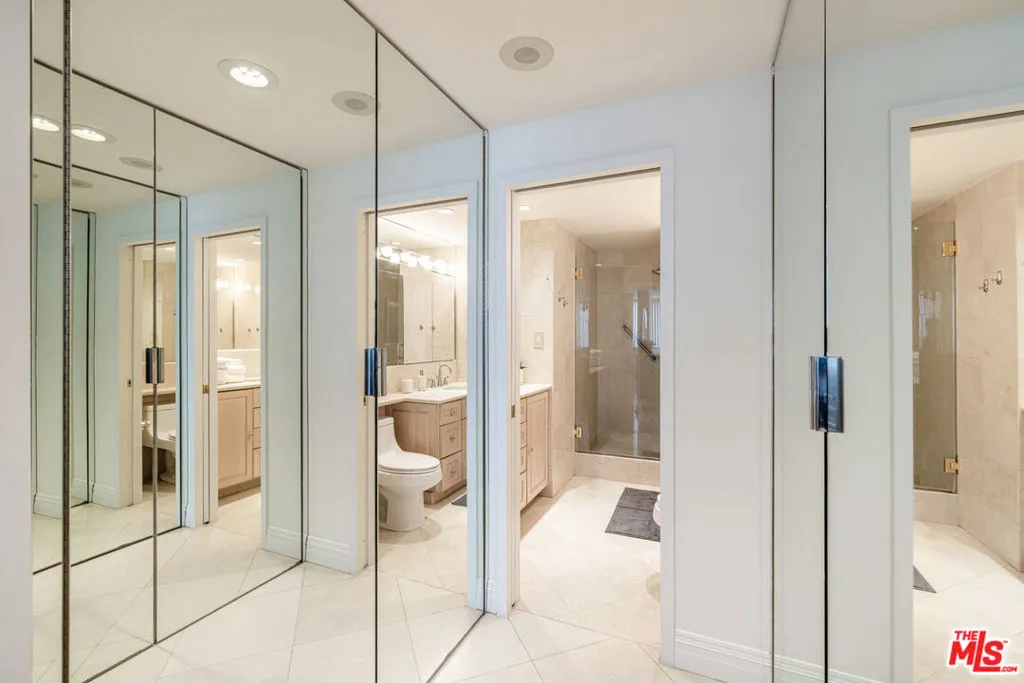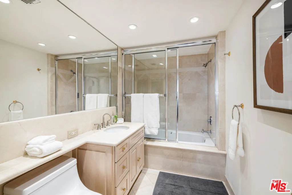 Large two bedroom, two bathroom condo in Century Towers in Century City. The unit has breathtaking unobstructed North and East facing Century City and Beverly Hills skyline views, considered to be the best unit stack in the building. Recently renovated with custom cabinetry, stainless steel appliances, a Subzero fridge, and natural stone floors. Both bedrooms are spacious and feature walk-in closets. Amenities of this guard gated community include 24 hour security, a doorman, pool, gym, and tennis courts.
