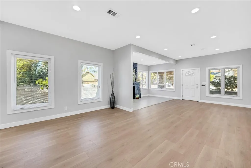 The living area is open and bright with plenty of recessed lighting. There are modern tiles and wood floors throughout.