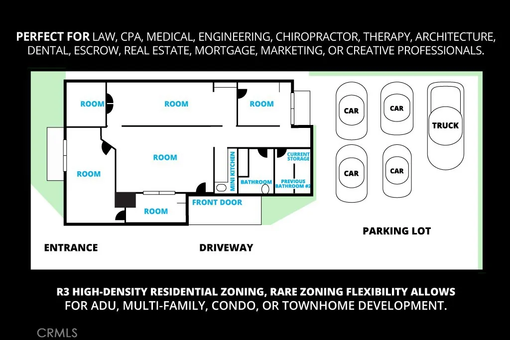 Rare Tustin opportunity, permitted office space with R3 high-density residential zoning and multiple exit strategies. Operating as a professional office since the 1980s (improved 2020), this 1,574 SF standalone building on a 5,750 SF lot is move-in ready for immediate use or primed for redevelopment. Ideal for a wide range of professionals including: Law, CPA, Medical, Dental, Therapy, Chiropractic, Physical Therapy, Occupational Therapy, Mental Health, Psychiatry, Psychology, Behavioral Health, Hospice & Palliative Care Administration, Home Health Agency, Private Duty Nursing, Case Management, Social Work, Substance Abuse Counseling, Architecture, Engineering, Real Estate, Escrow, Mortgage, Insurance, Financial Planning, Marketing, Consulting, Photography, Design Studios, Tech Startups, MedSpa, and more. Shovel-ready infrastructure with plumbing and utilities already in place for two bathrooms and a full kitchen, dramatically reducing future conversion costs. R3 zoning allows for multi-family, condo, townhome, ADU, or mixed-use development. Multiple exit strategies: owner-users build equity while occupying, investors lease now and redevelop later, developers maximize R3 density, or live/work buyers convert to residence plus ADU income. High-visibility Red Hill Ave location with exceptional I-5 Freeway access and strong daily traffic count. Use it. Lease it. Build it. The options are yours.