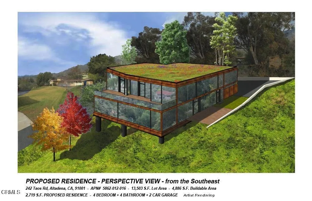 Located on a quiet hillside cul-de-sac, 242 Taos Road offers an opportunity to build in one of Altadena's most scenic foothill settings. The 13,485-square-foot downsloped lot features a large flat pad and sits along a paved road, capturing sweeping views that stretch from the San Gabriel Mountains to downtown Los Angeles and Pasadena. The elevation provides both privacy and an open outlook, while the site's orientation allows for flexible design options and abundant natural light. With easy access to Altadena's trail network, parks, and commercial centers, 242 Taos Road combines a peaceful foothill location with convenience and long-term potential.