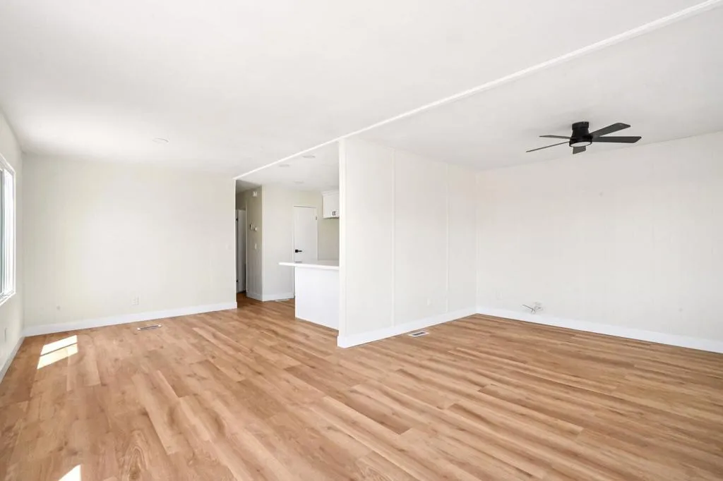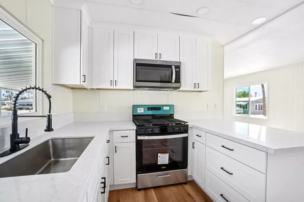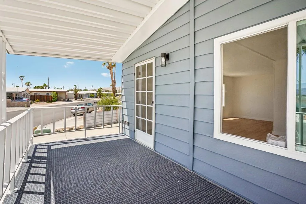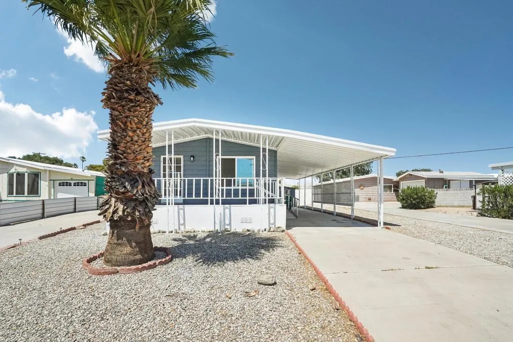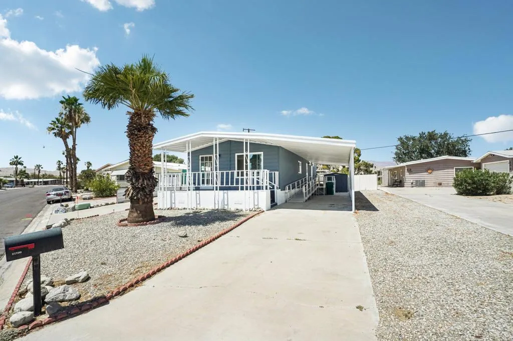 REDUCED TO SELL!! COMPLETE INTERIOR REMODEL! Mountain Views from Front Porch Patio area and Living Room. Open Kitchen to Dining Area with extra Breakfast Bar seating. Bright Open Kitchen with large window over single stainless steel sink and Pantry. Enjoy vinyl flooring, Quartz countertops, stainless steel appliances, energy efficient windows, ceiling fans, and recessed lighting throughout. Primary suite with private bath and large walk-in closet. Guest bedroom is serviced by hall bath. Laundry room. Carport with extra storage and direct access to side door. Best part is you OWN YOUR OWN LAND with low annual HOA dues. The 433A PERMANENT FOUNDATION enables Conventional, FHA/VA and Reverse Mortgage Financing. Tri Palm Estates and Country Club is a vibrant 55+ Community where your low monthly fee lets you enjoy unlimited golf for two Owners on the deed for the 18-hole Executive course and the 9-hole Par 3 course. Amenities include two outdoor community pools and spas, two lighted tennis courts/pickleball, shuffleboard courts, two practice putting greens, and a well maintained Clubhouse with dining, banquet facilities, and a recreation lounge bar. Social has a full calendar of events. Convenient to freeway access, Costco, Sam's Club, Home Depot, Walmart, Lowes, theaters, and many fine restaurants, while a short drive to Agua Caliente Casino, Acrisure Arena, and Rancho Mirage/South Palm Desert shopping are just minutes away. Plus, being within IID service territory means lower electric bills!
