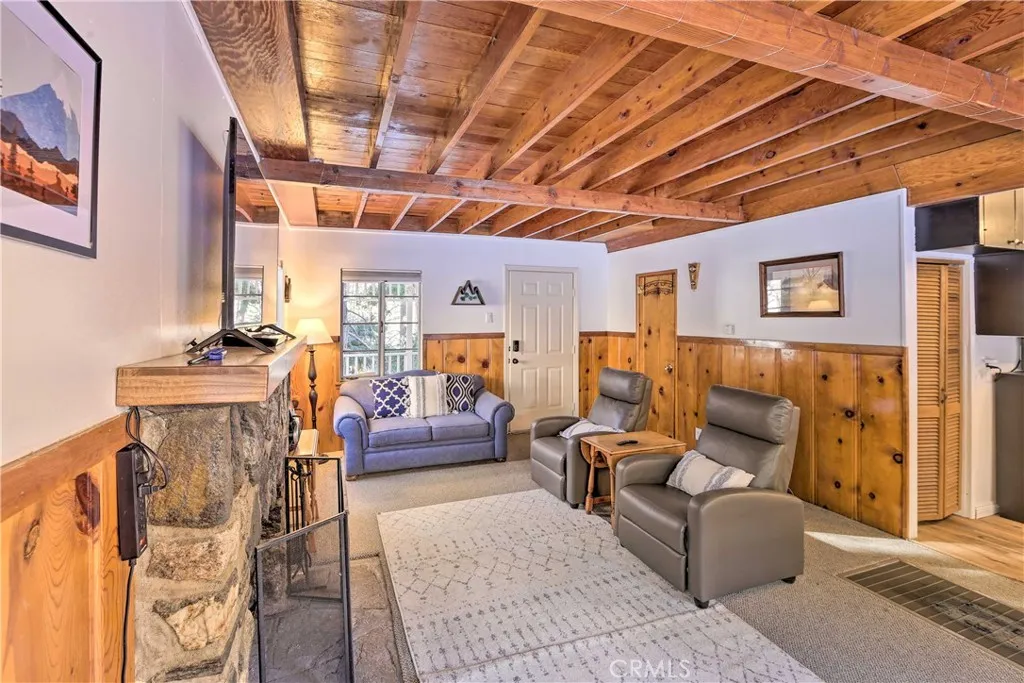 **Seller offering concessions to Buyer.** Welcome to 1069 Eagle Road, a Wrightwood property offering privacy, flexible outdoor space, and a layout well suited for mountain living. Situated on a spacious lot, the home features three separate driveways including a circular driveway in front for easy guest parking, a second driveway leading to the detached single-car garage, and a third driveway providing dedicated RV parking. The inviting wrap-around front porch with porch swing creates a welcoming place to relax and enjoy the mountain setting. Inside, the home features comfortable living spaces with a wood-burning fireplace and a recently remodeled downstairs bathroom. All bedrooms are located upstairs, providing separation between the living and sleeping areas and making the layout practical for both full-time living and vacation use. The fully enclosed backyard offers privacy and room to enjoy the outdoors, and includes a playhouse that adds charm and flexibility for recreation or creative use. This property works well as a primary residence, mountain getaway, or investment opportunity. The home previously operated as a successful Airbnb, and the majority of the furniture shown in the listing photos will be included in the sale, allowing for a smooth transition into a furnished rental or move-in ready home. Conveniently located near Wrightwood Village, hiking trails, and Mountain High Resort, the property offers easy access to year-round outdoor recreation while still providing the quiet charm of mountain living.