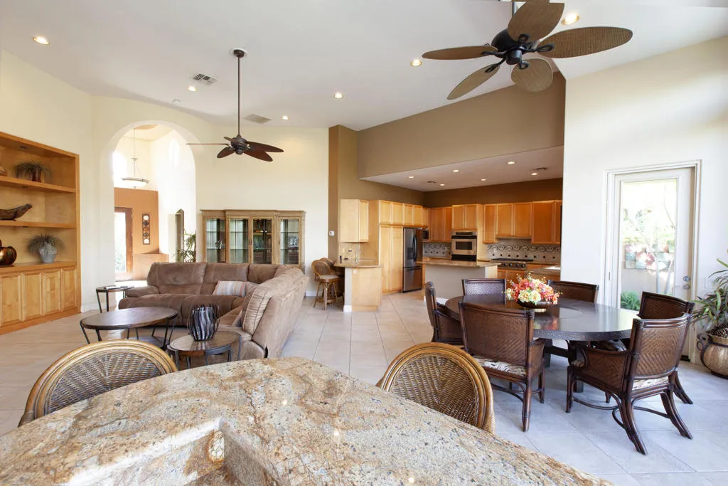 Enhanced Encanto I overlooking the 2nd fairway of the Jerry Pate course. This impressive expanded popular Encanto I plan has been modified & enlarged to create a spacious great room/formal dining area & impressive walk-in bar w/2 beverage refrigerators. Upgraded features boast voluminous ceilings; diagonal tiled floors; beautiful custom built-in cabinetry & fireplace w/raised hearth & mantel in spacious GR; ceiling fans in every room & designer paint& faux accents. The fabulous kitchen includes granite surfaces; pull-out drawers; stainless steel appliances w/ a 6 gas burner Viking cooktop. Owners will enjoy the expanded office/den w/built in desk, sofa pull out bed,& added windows for light. The wonderful tropical backyard makes this home complete w/pool/spa; extended patio with outdoor cooking station w/beautiful granite surfaces & bar seating area. The well maintained private exotic tropical backyard w/fruit trees makes this home complete. Additionally, the extra deep lot allows full sun on pool. Side yrd. w/sitting area & concreted walk-way. Garage offers epoxy floors; built-in cabinets & raised storage, Furnished per inventory.
