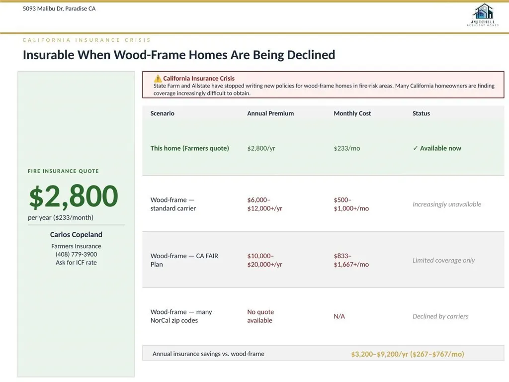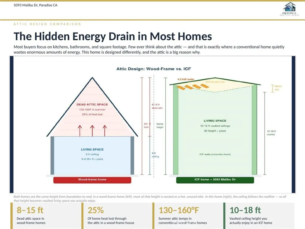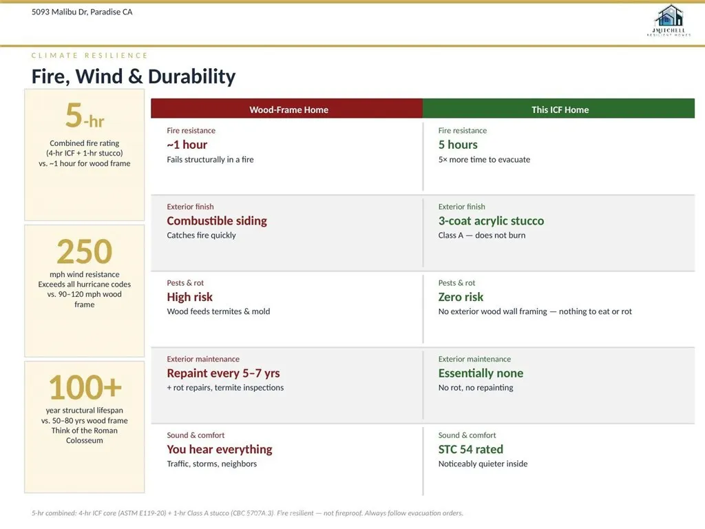 Forever Home. Built with Intention. Designed for Life. Designed as a true forever home, this 3,358 square foot custom residence combines structural integrity, energy efficiency, and refined comfort in one thoughtfully executed design. Constructed with Insulated Concrete Form (ICF) technology, the exterior walls consist of 6-inch steel-reinforced concrete flanked by over 5 inches of continuous insulation, delivering exceptional durability, fire resistance, and thermal performance. This PG&E Zero Net Energy qualified home is powered by owned solar, contributing to reduced utility costs. Insurance options available through Farmers Insurance reflect the strength of this construction method. Located in lower East Paradise, this 4-bedroom, 3-bath layout blends resilience with modern design. High ceilings, exposed wood beam accents, and black dual-pane Milgard windows bring natural light throughout. The great room is anchored by a fireplace and opens seamlessly to outdoor living through expansive sliding glass doors. The kitchen is designed for everyday function and entertaining, featuring shaker cabinetry with pull-out drawers, quartz countertops with full-height backsplash, induction range with convection oven, vent hood, walk-in pantry, and an oversized island with prep sink. Bamboo hardwood flooring runs throughout the main living areas and bedrooms, each bedroom thoughtfully appointed with its own ceiling fan. The primary suite includes vaulted ceilings, fireplace, patio access, a spacious walk-in closet, and a spa-inspired bath with dual vanities, soaking tub, and oversized tiled shower with bench and niche storage. Two additional bedrooms share a Jack and Jill bath with private vanities. A flexible fourth bedroom functions as an office, guest room, or playroom. Outdoor living is elevated by a 475 square foot California Room with dual ceiling fans, overlooking a newly resurfaced pool with brand new pool equipment and fresh landscaping. The home features a dual-zoned HVAC system with two independent mechanical units and fully ducted distribution for balanced, whole-home climate control. Additional features include an indoor laundry and mud room, new septic system, RV parking with 50-amp hookup, pre-wiring for electric vehicle charging, and enduring materials throughout. The neighborhood HOA and CC&Rs are still in effect at $0 annually. Built by local craftsmen to a high standard, this home represents intentional design, lasting comfort, and long-term value.