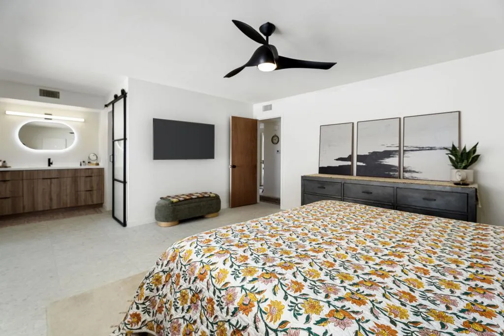 Significant Price Improvement! ~ Now Offering Exceptional Value on this fully updated Mid-Century Modern 2-bedroom, 2-bath condo designed by renowned architect Hugh Kaptur. Offered fully furnished--just bring your toothbrush! Nestled on a peaceful cul-de-sac in South Palm Desert, this residence blends iconic architectural style with modern comfort and convenience. Step inside to a spacious open-concept living area where a striking stone fireplace serves as the focal point. Soaring vaulted ceilings and clerestory windows fill the home with natural light, complemented by elegant tile flooring and motorized shades for privacy. The updated Kitchen features sleek Quartz countertops and Stainless Steel Appliances, while the adjacent dining area provides an inviting space for everyday living or entertaining.The Primary Bedroom offers a walk-in closet, en-suite bath, and direct access to the patio with beautiful mountain views. The Guest Bedroom also features a walk-in closet, and an additional updated full bath provides comfort. The inviting private Patio creates the perfect indoor-outdoor lifestyle, Mountain Views & Ideally located near El Paseo's world-class shopping and dining. Don't miss this opportunity! Additional highlights include direct access to a 2-car garage with a laundry area complete with washer, dryer, and an extra refrigerator. Outdoor recreation including desert hiking and biking. Community amenities include a Pool, Spa, and Tennis Courts--offering a resort-style lifestyle in the heart of Palm Desert. Experience the perfect blend of mid-century architecture, modern updates, and desert tranquility in this exceptional home.