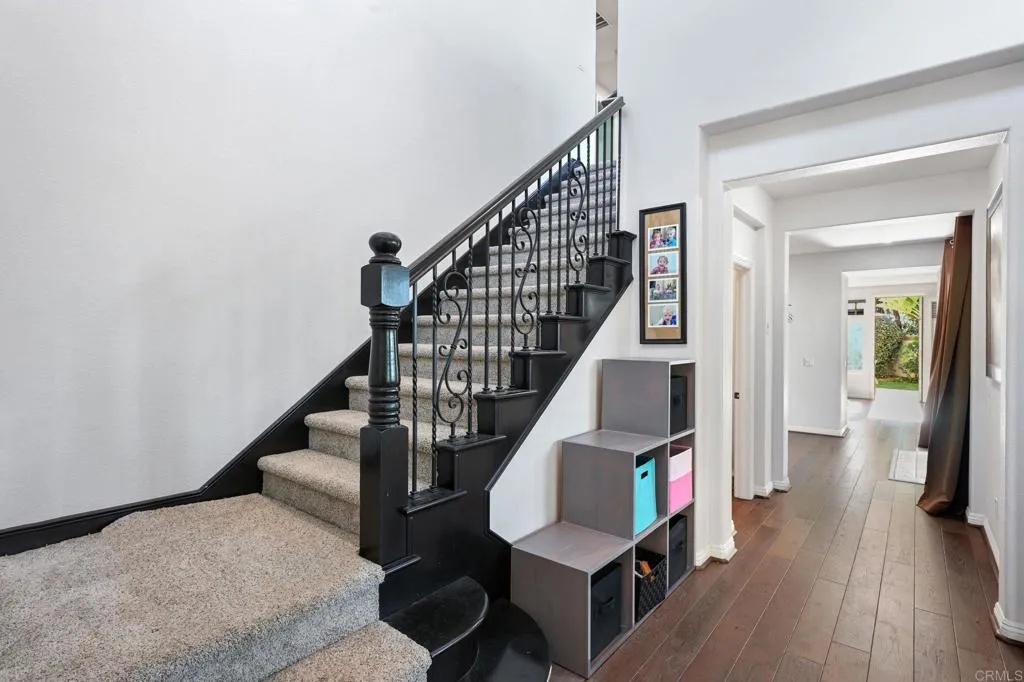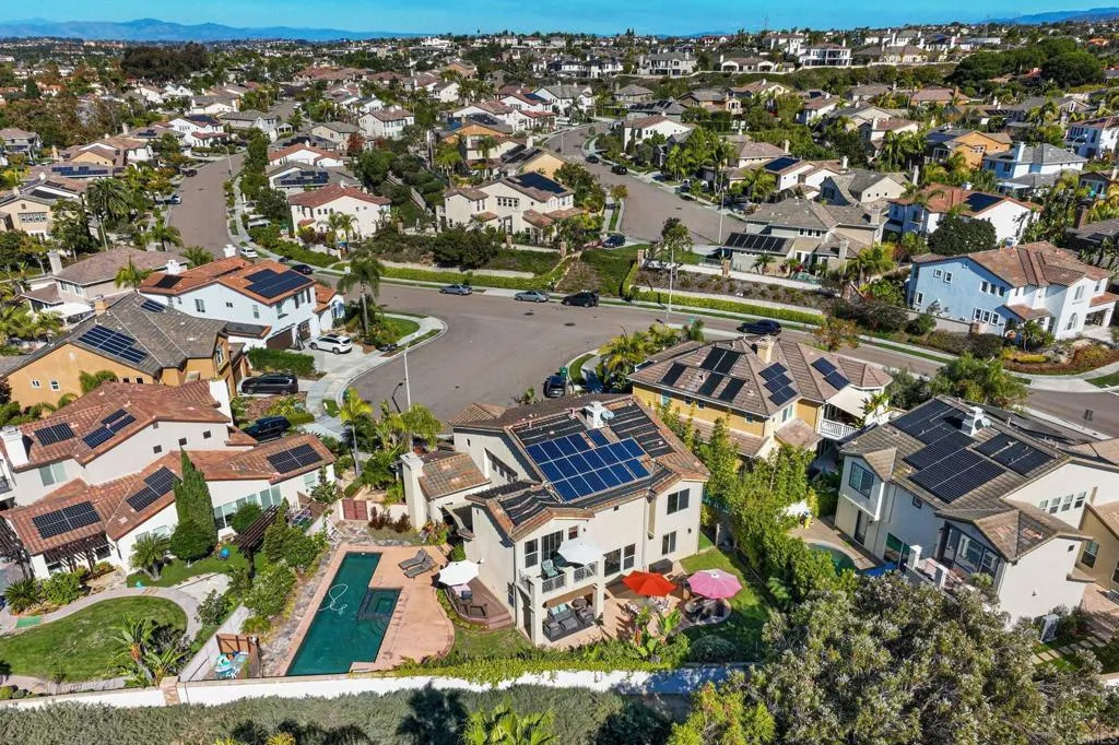 Welcome to this beautiful oasis situated in the ideal cul-de-sac of the prestigious Bay Collection. Enjoy panoramic ocean views and sunsets, expansive green space, a large pool and spa, outdoor BBQ, and a custom elevated patio deck — all on one of the largest lots in the community. This home features leased solar for the house and owned solar for the pool, as well as a whole-house fan for energy-efficient comfort. Inside, you’ll find beautiful granite and dark wood cabinetry throughout, travertine floors and granite countertops in the bathrooms, and newer wood floors that flow through the open living areas. The kitchen has been thoughtfully updated with new canned LED lighting that never needs bulb replacement, fresh pendant lights, and convenient pull-out shelving in the cabinets. Large, newer sliding glass doors fill the home with natural light and invite in the refreshing ocean breeze. The floor plan is flexible with one full bedroom and bath downstairs, plus three bedrooms and a spacious bonus room upstairs that could serve as a fifth bedroom. The front living room has been enclosed with elegant double glass barn doors, creating a perfect home office or quiet retreat. Additional upgrades include a tankless water heater, recirculating pump for instant hot water, and a three-car garage with built-in cabinetry, new lighting, and a one-year-old smart garage door opener with a built-in camera. The seller has added extensive landscaping with fruit trees, a built-in BBQ island, and the pool and spa, creating a private outdoor paradise. From the master balcony, unwind in the evenings and enjoy breathtaking sunsets over the ocean. All this, located close to top-rated schools, shops, restaurants, Batiquitos Lagoon, and the beach, making this one of Carlsbad’s most desirable neighborhoods!