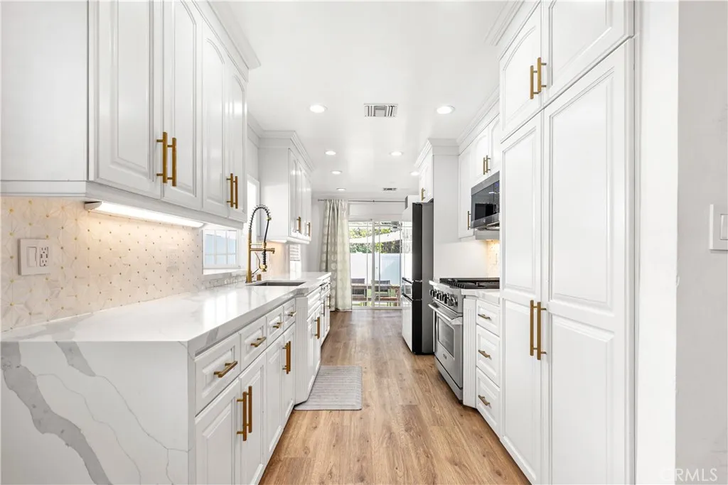 HALF OFF 1ST MONTH'S RENT! Beautifully remodeled, modern 3 bedroom 2 bath home in the heart of Sherman Oaks. Key Features: Chef's kitchen with Calacatta Gold quartz countertops, stainless steel Viking appliance package, customizable Samsung refrigerator with beverage station, and under cabinet lighting. New wide-plank luxury vinyl flooring and recessed lighting throughout. Central A/C and heat and tankless water heater. Washer and dryer included. Corner lot with large gated front and backyard with turf and drought tolerant landscaping. Kester Avenue Gifted Magnet Elementary school district within convenient walking distance.