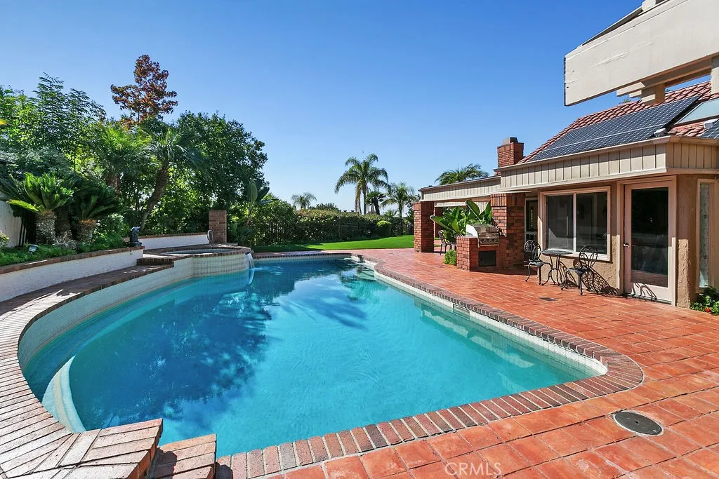 This serene and tranquil Villa Park lux estate enjoys one of the most unique and exclusive locations available on the market today. Tucked away in Villa Parks rolling hills, this expansive 5362 square foot gem boasts a true cul-de-sac location, complete with gated entry. The mix of mid-century modern style and extremely private location gives this estate a feeling reminiscent of the historic Hollywood Hills. Enter through the automated privacy gate into lush grounds with mature landscape, drought tolerant turf and ample on-site parking. Glass inlaid double doors give way to a spacious and inviting entry. Travertine floors, floor to ceiling windows, and crisp architectural lines set the tone for this elegantly finished estate. The living room boasts soaring ceilings, corner fireplace, custom base, and clear pane elevated windows for lots of natural light. The dining room is spacious and expertly located between the kitchen and formal living room. With plenty of room for a 10-person dining set, this dining room is perfect for quiet family nights or those busy holiday events. The kitchen is for the culinary enthusiast, complete with high end Thermador appliances, Sub Zero Fridge, double ovens, 6 burner gas range w/ hood, granite counters, stain grade custom cabinets, and an open ceiling concept. The family room is open and kitchen adjacent giving a great room concept feel and lends itself perfectly to family gatherings and entertainment. The primary bedroom feels open and awash with light due to the cathedral ceilings and corner window set complete with views of the beautiful backyard. The primary bath is finished with wrap-around dual vanity, large soaking tub, skylight, and elegant lead glass picture window for added natural light. Upstairs one finds an incredible bonus room with huge square footage, elegant wood grain built in bar, soaring ceilings, and finely appointed second primary suite. The backyard is peaceful and serene, with tranquil Koi pond, resort like pool and elevated spa, wrap-around patio/loggia, built in BBQ, and private ambiance. Other exciting features include whole house fan, 3 separate HVAC units, fully finished garage with EV charging port, PAID for 39 panel 13.65 KW solar system, mature fruit trees, 4-bedroom PLUS office and private gym, 3 full baths and 2 half baths, skylights, and so much more. Call immediately for additional details.
