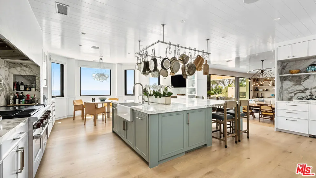 A contemporary coastal estate with panoramic ocean views, 29754 Baden Place offers refined design and true indoor-outdoor living. Set above the Pacific, the home features clean modern lines, hand-troweled plaster walls, expansive terraces, and every luxury amenity. The main level opens to a bright foyer and glass-lined living spaces overlooking the ocean. The dining room and fireside lounge are ideal for entertaining, while the library and bar lounge offer a private retreat. The chef's kitchen includes Miele and Wolf appliances, marble counters, a large island, and a breakfast nook with ocean views. Upstairs, the primary suite features vaulted ceilings, a private oceanfront balcony, a sleek fireplace, and a spa-like bath with a soaking tub framed by an ocean-view window, dual stone vanities, a glass shower, generous closets, and a private sauna. Resort-style outdoor living includes multiple terraces, a pergola-covered lounge with fireplace, manicured gardens, a pool and spa, and a dedicated pickleball court- all oriented toward sweeping views of the Malibu coastline. From here, it's common to watch dolphins and whales passing along the shore. Modern systems include a Crestron smart home platform, full-property security and cameras, and thoughtful materials throughout, including natural wood flooring, custom plaster finishes, and designer fixtures. A rare blend of privacy, architecture, and oceanfront perspective, 29754 Baden Place offers a serene seaside retreat designed for elevated Malibu living.