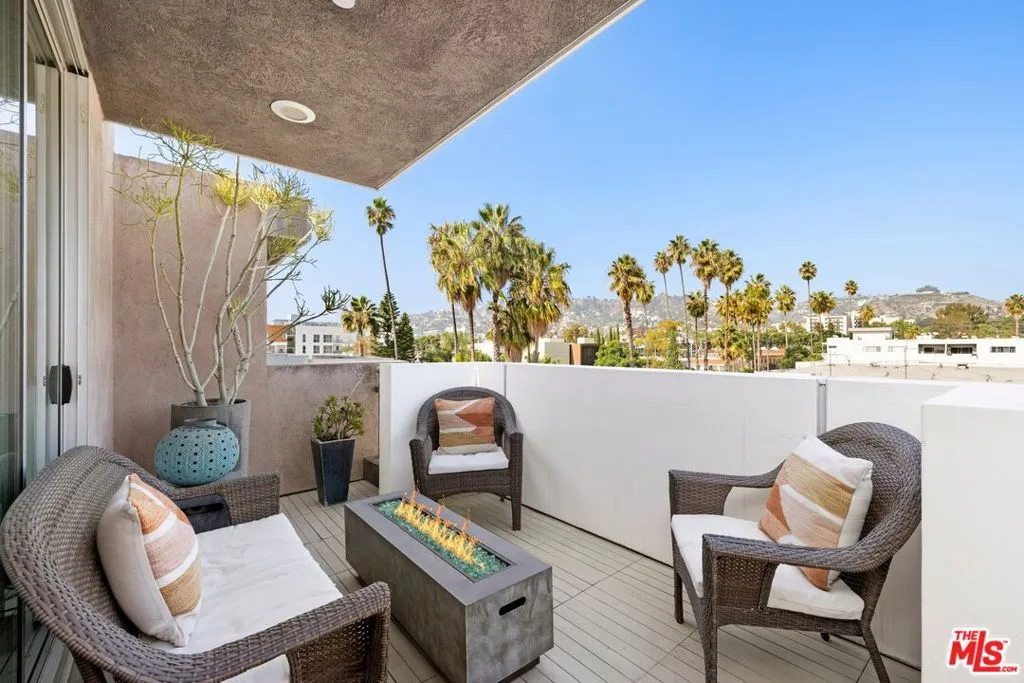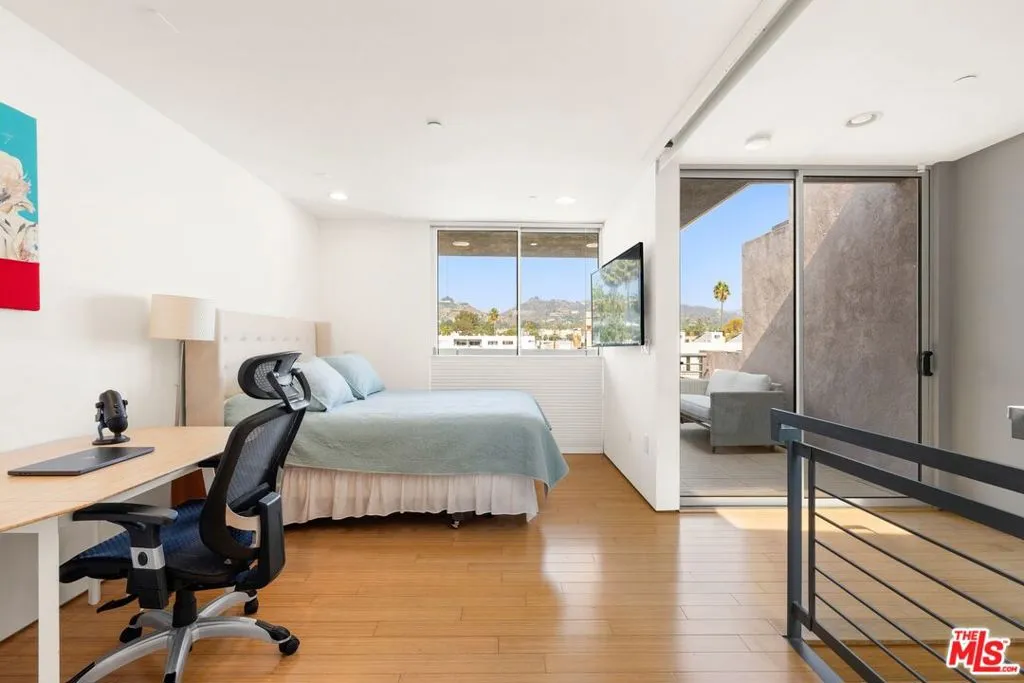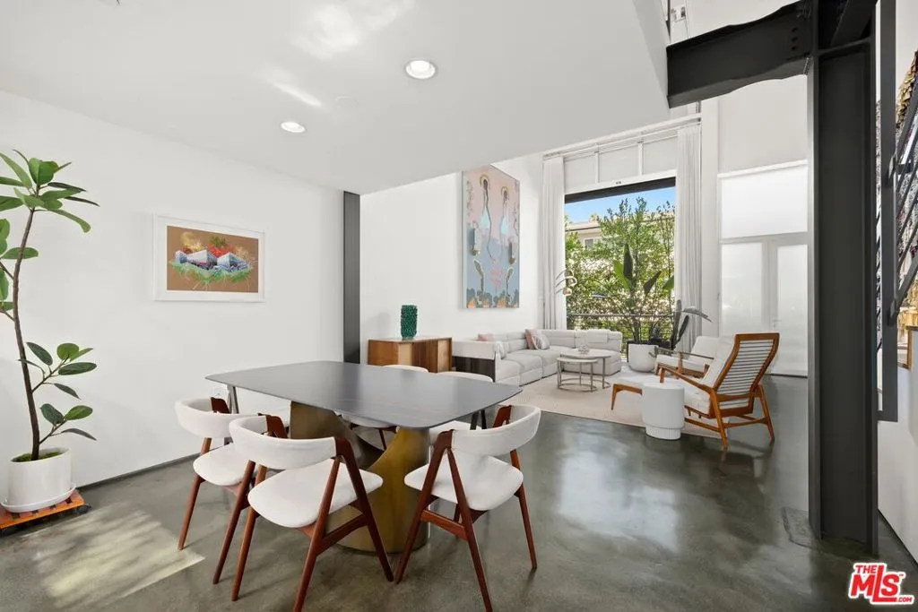 Rare opportunity at 950 Art Lofts in the heart of West Hollywood. This architectural townhouse features soaring 18-ft ceilings, an oversized industrial roll-up window, and striking custom glass-and-steel details. Polished concrete and bamboo floors flow through the open floor plan, anchored by a European-style kitchen with high-end appliances and designer finishes. Flexible mezzanine space, two primary suites with custom closets and spa-inspired baths, plus a bonus room for a third bedroom or office. Top-floor suite opens to a private patio with panoramic views of the Hollywood Hills, and the Hollywood sign. Central air, guest parking, and move-in ready. Walkable to the city's finest dining, shopping, and nightlife. Set in West Hollywood's most walkable enclave, residents enjoy effortless access to dining, shopping, and nightlife, with six artisanal coffee houses just steps from your door.