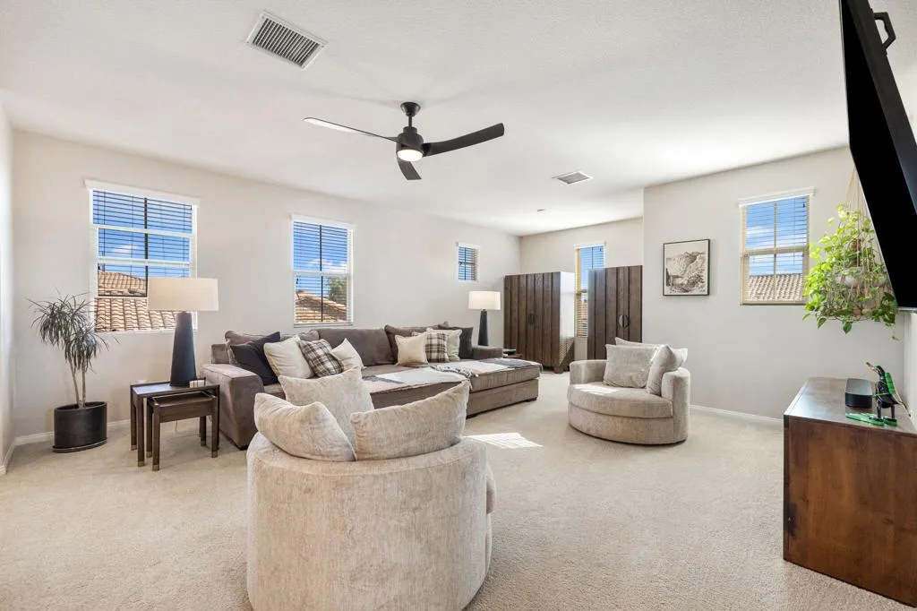 Welcome to this spacious 5-bedroom, 2-story home offering comfort, functionality, and style throughout. The thoughtful floor plan features a convenient first-floor bedroom, a formal dining room, and a versatile den ideal for an office or playroom. The kitchen includes ample cabinetry, granite countertops, and a charming breakfast nook with direct access to the backyard. Upstairs, a large loft provides additional living space, while the primary suite serves as a private retreat with dual vanities, a makeup vanity, a soaking tub, and a separate shower. Outside, enjoy the covered patio surrounded by lush landscaping and the added privacy of backing to a peaceful greenbelt--creating the perfect setting for relaxation and entertaining. Located in the 55+ community of Trilogy Polo Club.
