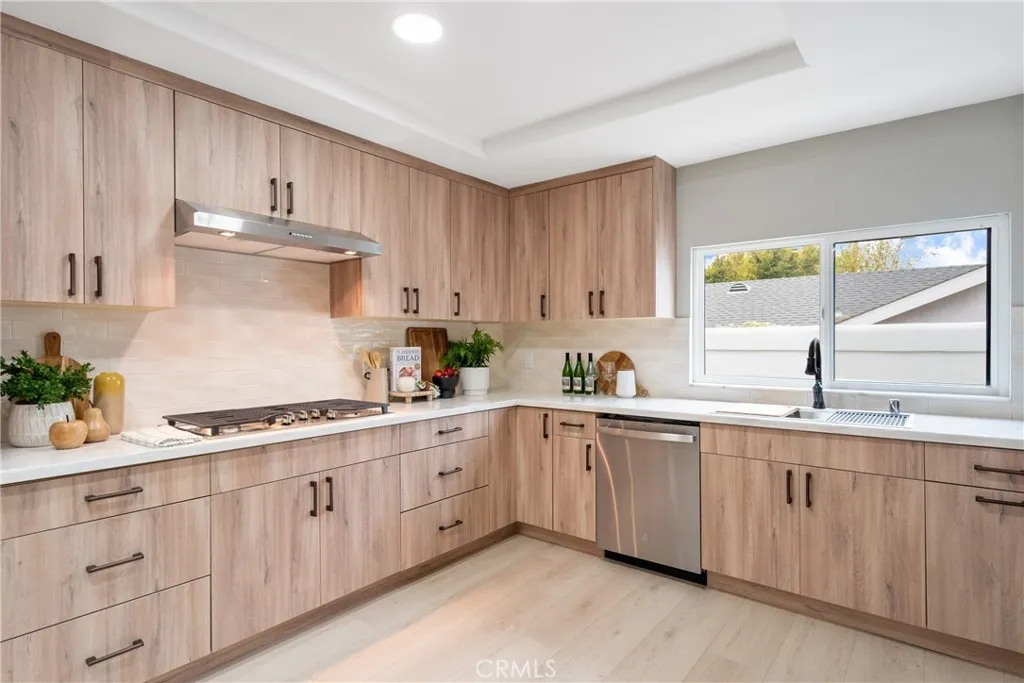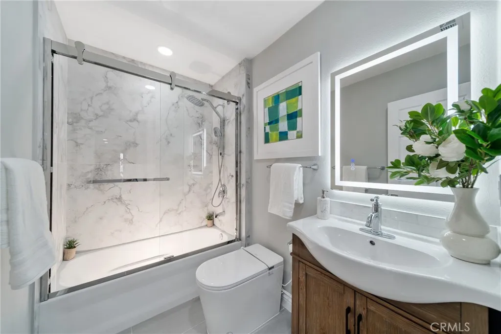 *Single-level, single-loaded street — beautifully remodeled home~Located on a serene single-loaded street with no front-facing neighbors, this beautifully remodeled single-level home blends modern elegance, warmth, and convenience. Offering approximately 2,008 sq. ft. of living space on a 6,500 sq. ft. lot, the residence features four spacious bedrooms, three stylish full bathrooms, and a convenient powder room—all thoughtfully designed for comfort and functionality. The open-concept living and dining area welcomes you with vaulted ceilings, abundant natural light, and luxury vinyl plank flooring throughout. The freshly painted interior creates a clean and inviting atmosphere. The spacious, chef-inspired kitchen showcases sleek marble countertops, brand-new stainless steel appliances, and contemporary flat-panel European-style cabinetry in a warm light-oak tone, accented by matte brown hardware for a sophisticated finish. Each bedroom enjoys high ceilings for an enhanced sense of space and comfort. All bathrooms have been completely renovated with spa-like designs, featuring frameless glass showers with large-format marble-look porcelain tiles, rainfall shower heads, and elegant vanities with LED backlit mirrors that provide a soft, modern glow. Additional upgrades include partial electrical and plumbing improvements (including the garage), new light fixtures throughout, a brand-new water heater, and an epoxy-coated garage floor. Outside, the 6,500 sq. ft. lot offers spacious front, side, and rear yards—freshly landscaped with new real grass, trees, and a tranquil fountain. The backyard has been newly paved and includes a built-in BBQ, providing the perfect setting for outdoor living and entertaining. Positioned within a desirable Saddleback Valley Unified School District and close to shopping, dining, and recreation, this home also features public sewer and water, no HOA fees, no Mello-Roos taxes, and a large gated side yard ideal for RV, boat, or extra parking. Don’t miss the opportunity to live in this beautiful home.