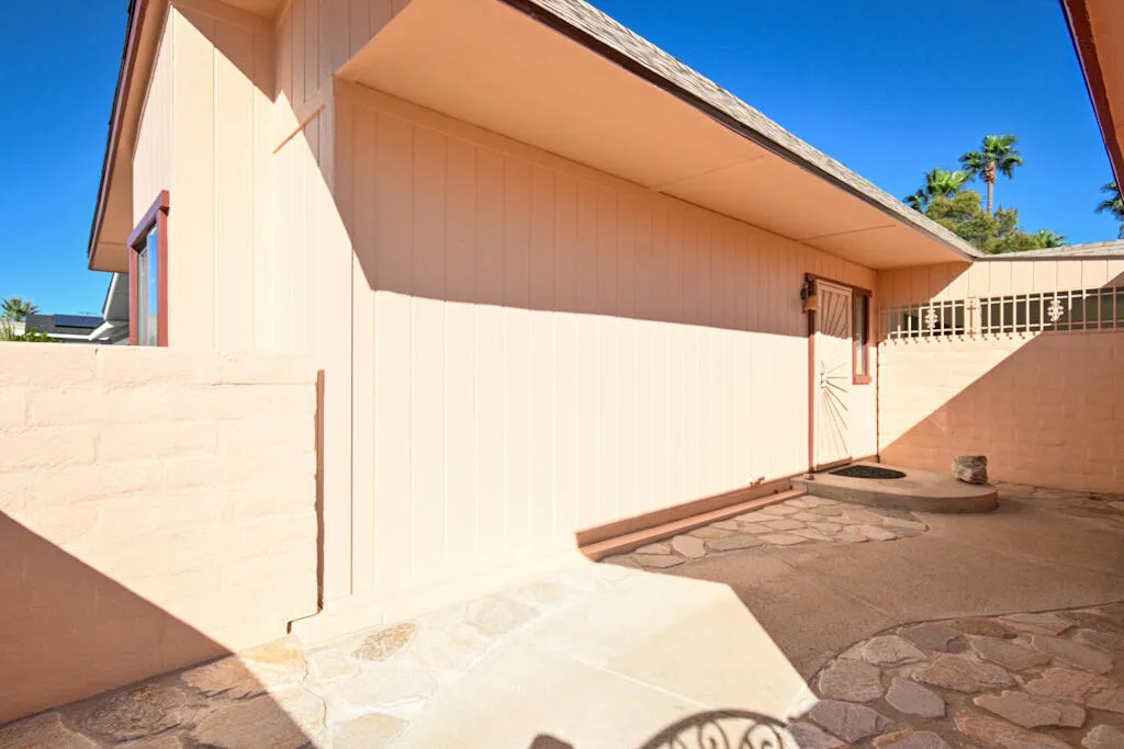 A surprisingly charming and well cared for second home for the seller for years. It has been gently used and many updates have been done. The home has a 433A Certification. Newer patio doors(3) and 4 new windows. Home has Desertscape for low maintenance Crawl space has custom covers. The home offers a split plan for privacy The location is spectacular as French Doors open up to a greenbelt near the tennis courts and the club house is a short walk and leave the car at home. There is a lot of light and is a joy to see. The patio is covered and enclosed for your security and enjoyment. This is really a treat to see!!