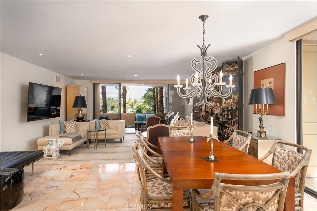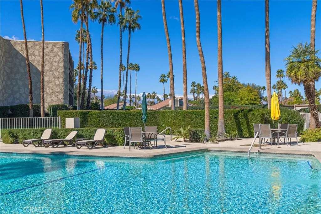 Welcome to The Diplomat—an iconic South Palm Springs address—where double doors open to a spacious two-bedroom home designed for effortless desert living. Floor-to-ceiling windows showcase incredible mountain and palm views, bathing the space in natural light and creating an inviting indoor-outdoor atmosphere. The extended galley kitchen is functional, featuring dual French-door stainless refrigerators, ample cabinetry, and a built-in office nook ideal for remote work or everyday planning. A mirrored wet bar connects seamlessly to the open living and dining area, where upgraded lighting sets the perfect mood for relaxing evenings or entertaining guests. The primary suite is a true retreat with double sinks, a walk-in closet plus an additional slider closet, and peaceful views. A well-positioned guest bedroom and nearby three-quarter bath add flexibility for visitors, hobbies, or a home office. Enjoy the ease of secure underground parking with elevator access, just steps from your front door. Developed by renowned builder Robert Grundt, The Diplomat is admired for its striking sculptural architecture, lush landscaped open space, and resort-style amenities, including a sparkling pool and spa. The HOA includes Spectrum TV with premium channels, Wi-Fi internet, water, and trash, making ownership refreshingly low-maintenance. Just across the street from Smoke Tree Village, you’ll have markets, boutique shops, a pharmacy, and local restaurants right at your fingertips.