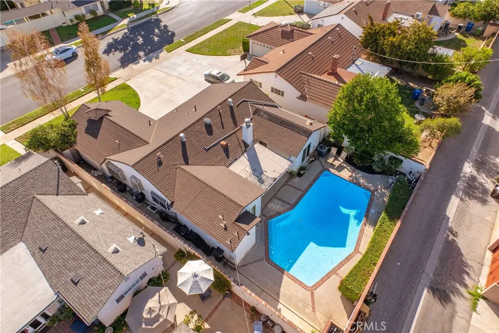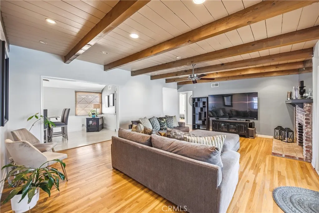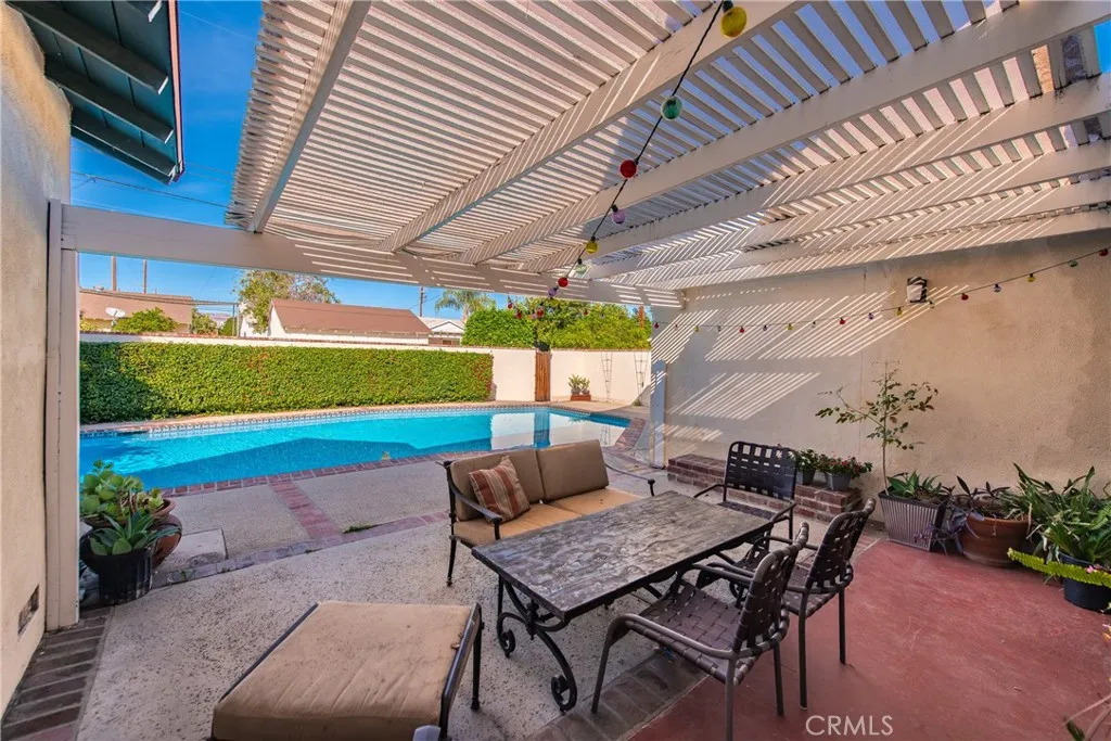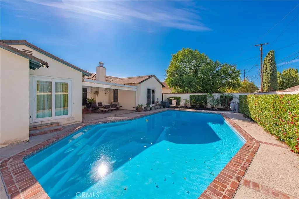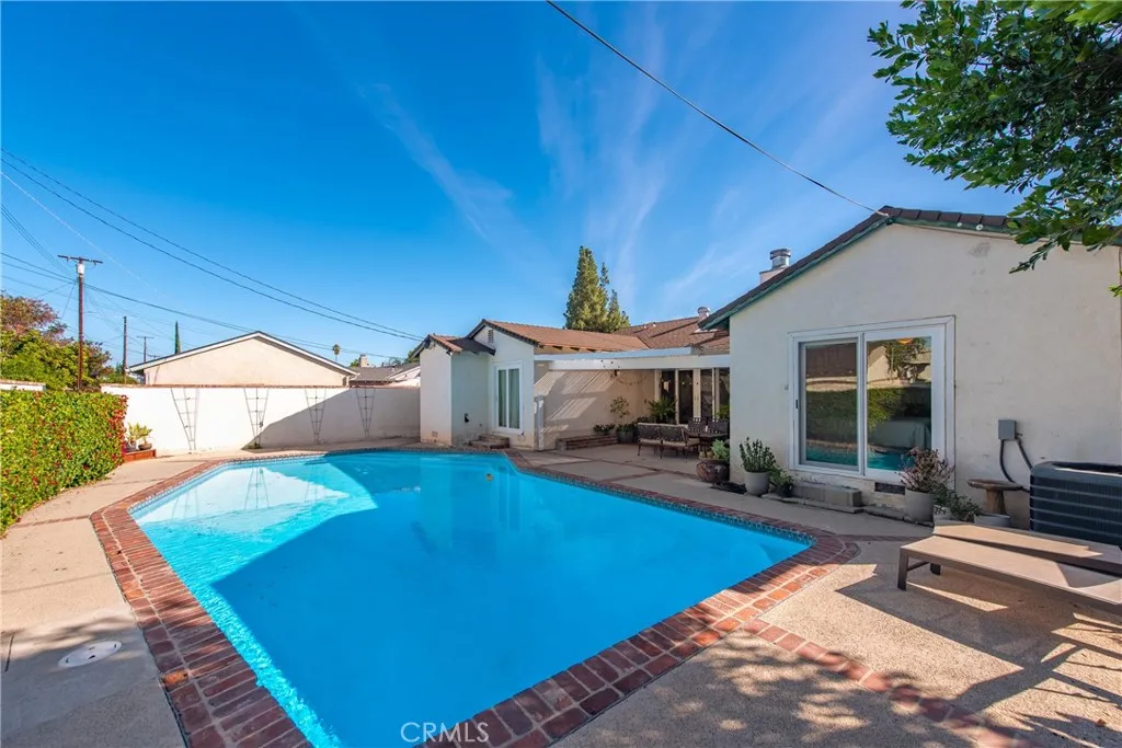 Welcome home to this inviting 4-bedroom, 3-bath Northridge residence offering 1,900 square feet of comfortable living space. The open layout features a spacious living room with wood-beamed ceilings, hardwood floors, and a charming brick fireplace. The kitchen offers ample cabinetry, tiled counters, and built-in appliances, flowing easily into the family and dining areas—ideal for gathering and entertaining. The primary suite includes a private bath and generous closet space, while secondary bedrooms are bright and welcoming. Outside, enjoy a large covered patio and sparkling pool—perfect for relaxing or hosting friends and family. With an attached two-car garage, central air and heat, and a great Northridge location near parks and schools, this home combines comfort, character, and everyday convenience.