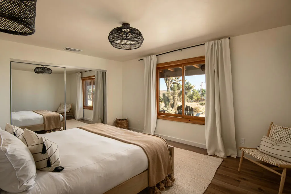 A private desert hideaway in Pioneertown set on just under 2.5 acres, offering wide open views, modern finishes, and a valuable second parcel for added space, privacy, or future potential.Designed with a refined blend of rustic and contemporary elements, the home features soaring wood ceilings, large windows that frame the surrounding mountains, and a spacious interior layout centered around a striking wood-burning fireplace. The kitchen includes elevated materials, custom wood cabinetry, and an easy flow into the dining and living areas, creating a comfortable setting for everyday living and gatherings.The home offers three generous bedrooms and three baths, including a well appointed primary suite with a walk in shower, dedicated vanity area, and a soaking tub oriented toward the desert landscape. A bright flex room adds a dedicated space for work, creativity, or quiet retreat, and the large garage provides ample storage or workshop potential.Outdoor areas include a wood deck, cowboy pool, spa, BBQ and dining area, and multiple lounge spaces for sunrise, sunset, and stargazing. The combined parcels create a rare sense of openness while still offering defined outdoor living spaces throughout the property.Located within walking distance to downtown Pioneertown, Red Dog, and Pappy and Harriet's, and a short drive to Joshua Tree National Park and the shops and restaurants of the High Desert.A standout desert property with modern construction, elevated materials, generous interior volume, and a valuable bonus parcel, ideal as a full time residence, private retreat, or an incredible opportunity to create a premium short term rental.