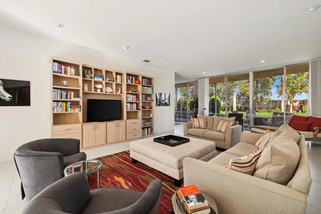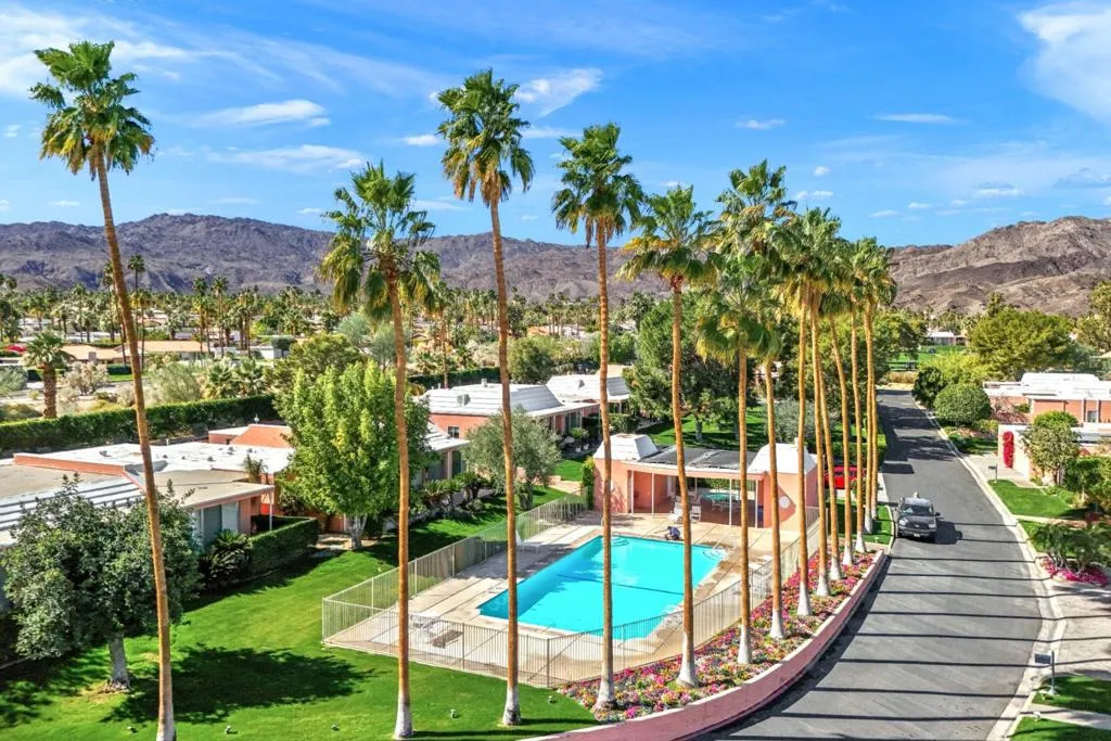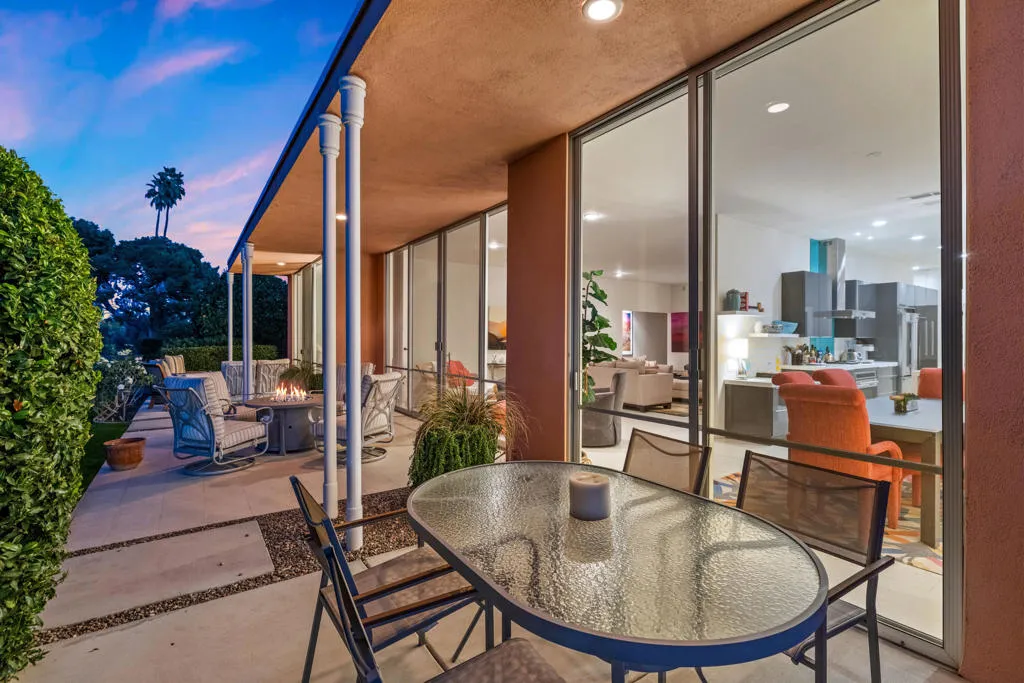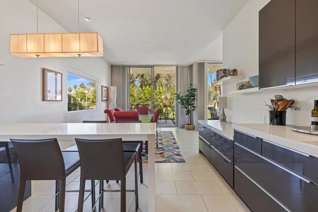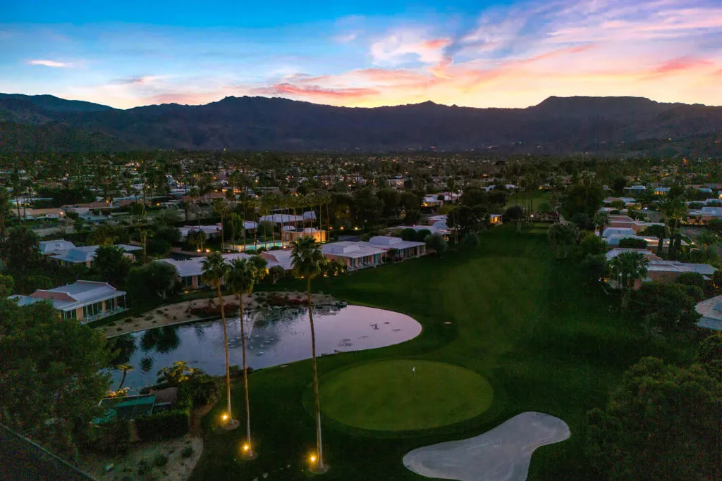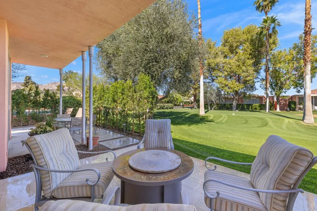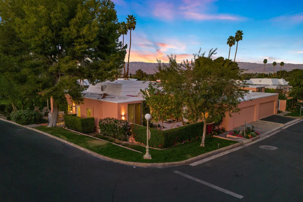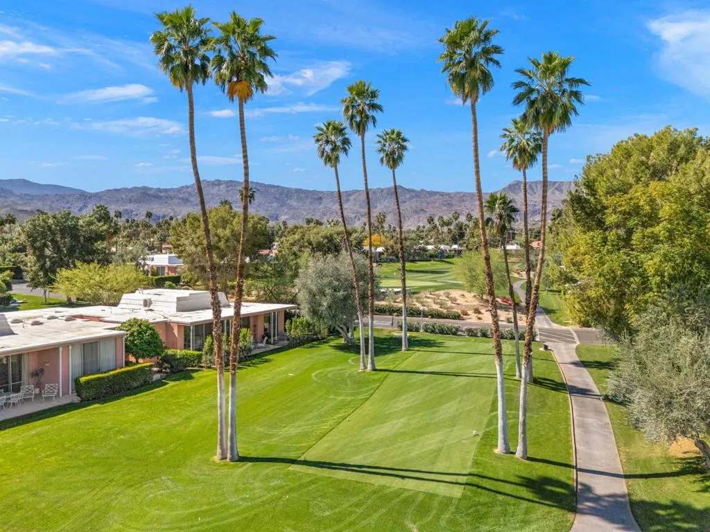 Presented in Beautiful Marrakesh Country Club, this Hollywood Regency Villa in a rare corner location features classic white wrought iron gates which open to a serene courtyard with walled greenery and pathway leading to the iconic Marrakesh double front doors. This D-plan, the largest in Marrakesh at 2,427 sq. ft., offers 3 bedrooms and 3 bathrooms in a beautifully updated design. The stunningly modern kitchen features a sleek breakfast bar, while generously sized bedrooms--with walk-in closets--offer ideal separation for privacy. The primary suite, overlooking the golf course, serves as a tranquil retreat with a luxurious spa-inspired bathroom, freestanding soaking tub, and windows framing lush greenery for a true Zen escape. Floor-to-ceiling glass flood the home with natural light and showcase fairway views of the north-facing 7th hole and spacious leisure terrace. Additional highlights include an ensuite guest room, a versatile office or den flex space, a stylish powder room, and an attached garage--elevating desert living to its finest. Marrakesh is a boutique country club with an ideal central valley location amongst a few of the desert's finest private clubs. Amenities include 18-hole private executive golf course, tennis, pickle ball, 14 pools and spa, a fitness center, and an active and newly-remodeled club house with fine dining. Marrakesh is near famous El Paseo with all of its elegant boutiques, restaurants, art galleries and coffee houses.