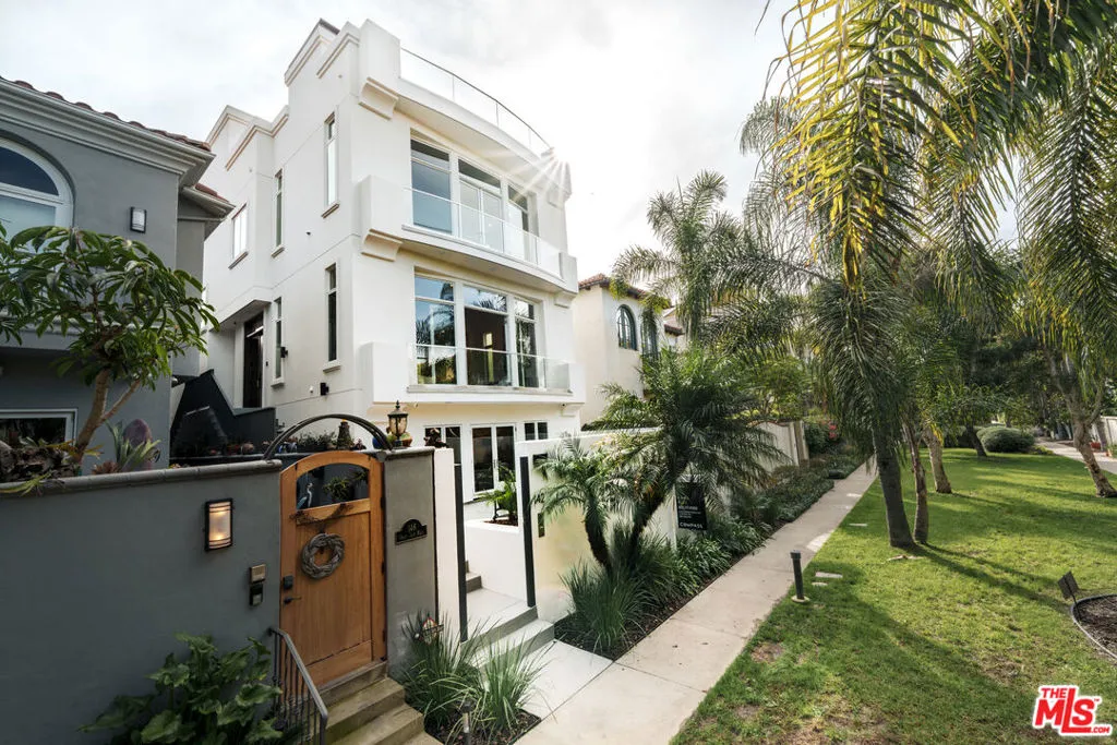 Recently completed multi-million-dollar renovation elevates this four-story architectural residence, discreetly nestled on a cul-de-sac walk street that evokes the serenity of a hidden park. This exceptional home offers an atmosphere of tranquility just steps from the beach and the Ballona Lagoon, and moments from the Marina's premier dining, boutique shopping, theaters, and picturesque canal paths. Thoughtfully designed with 4 bedrooms and 5.5 baths, the residence showcases an open-concept layout bathed in natural light, featuring Onyx white porcelain tile floors, refined custom finishes, and recessed LED lighting throughout. The gourmet kitchen is a masterpiece of design, appointed with Quartzite Naica countertops, a waterfall island, marble Arabescato Silver Honed backsplash, luxe high-gloss and soft-close cabinetry with maple and birch interiors, and Wolf/Sub-Zero appliances. A sit-up island bar and adjoining kitchen dining area complete with a cozy fireplace and view patio create an inviting central gathering space that flows seamlessly into the butler's pantry, spacious dining area, and living room with a stunning fireplace and a balcony overlooking the walk street park. The upper level is anchored by an expansive primary suite, offering a tranquil sitting area, private terrace with greenbelt park views, and a spa-inspired bath featuring white-oak cabinetry, Carrara marble accents, dual sinks, and a generous walk-in, designer closet. Two additional upstairs bedroom suites are enriched by natural light and elevated views. The first floor hosts a maid's/guest suite and a large family room ideal for entertaining, with flexible space for an office, wine room, or playroom. A spacious private patio completes this level, providing an exceptional indoor-outdoor living environment. An elevator services all floors, including the top-level office/loft/gym/entertainment, flexible space, which opens to two expansive rooftop decks showcasing sweeping city, mountain, and peek-a-boo ocean views. Recent enhancements include new stucco, energy-efficient windows and doors, a PVC roof, updated landscaping and lighting, and a 3-car garage with new epoxy flooring. More than a home, this is a striking statement of modern design, comfort, and craftsmanship on the coveted Silver Strand.
