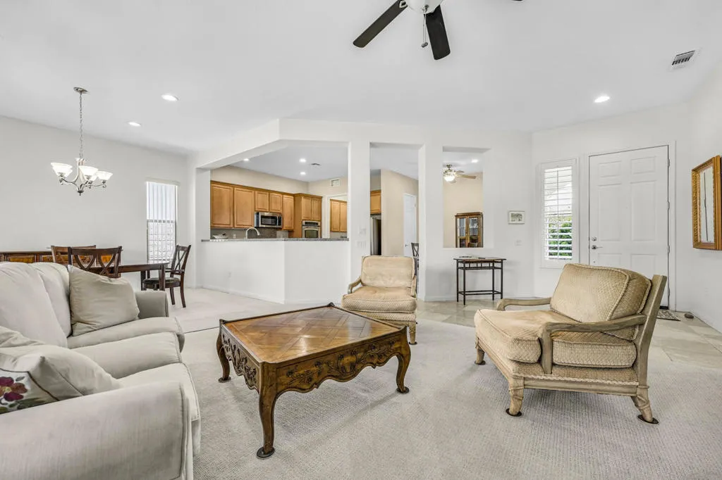 Discover comfort, style, and easy desert living in this beautifully maintained Madera floor plan, nestled within the premier 55+ active adult community of Sun City Shadow Hills. Offering 1,854 sq. ft. of thoughtfully designed living space, this home features a desirable west-facing backyard perfect for enjoying golden desert sunsets. Inside, an inviting open layout seamlessly connects the main living areas. The gourmet kitchen boasts granite countertops, double ovens, a central prep island, and a charming breakfast nook--ideal for casual dining. A separate dining area flows effortlessly to the covered patio for indoor-outdoor entertaining. A versatile den offers the perfect space for a home office, library, or creative retreat. The primary suite provides a peaceful haven with a spacious walk-in closet and a well-appointed bath. The generously sized guest bedroom ensures comfort for visitors or additional flexibility for your lifestyle needs. Outdoors, the low-maintenance landscaping and private backyard create a serene environment for relaxing or hosting gatherings. Residents of Sun City Shadow Hills enjoy resort-style amenities including two clubhouses, two golf courses, fitness centers, pools, tennis and pickleball courts, and an array of social activities. Don't miss your opportunity to make 40125 Calle Ebano your next home sweet home!