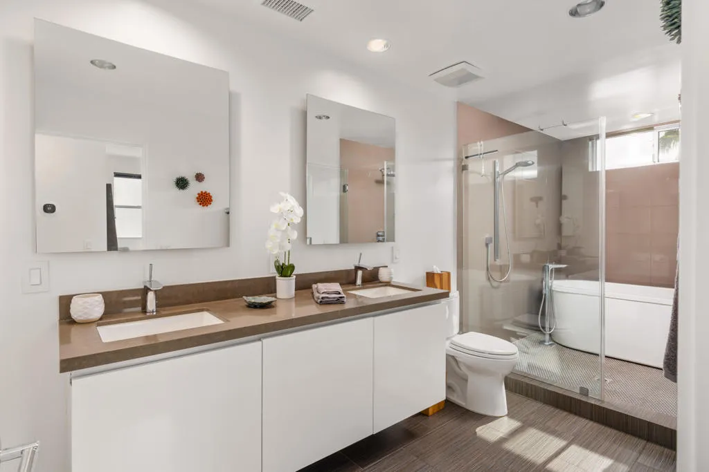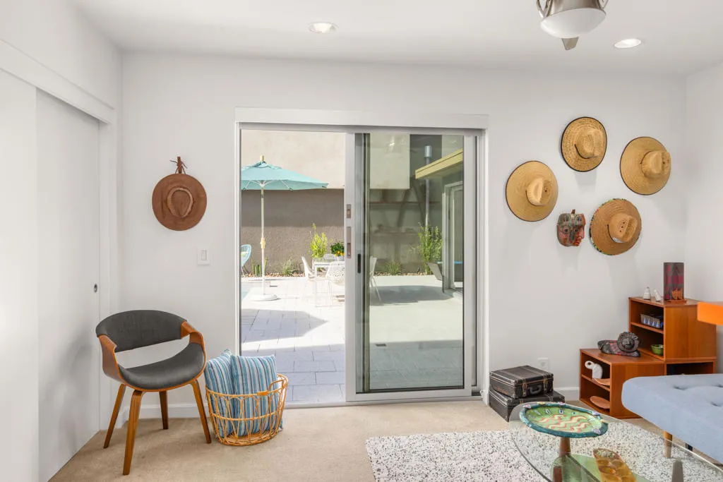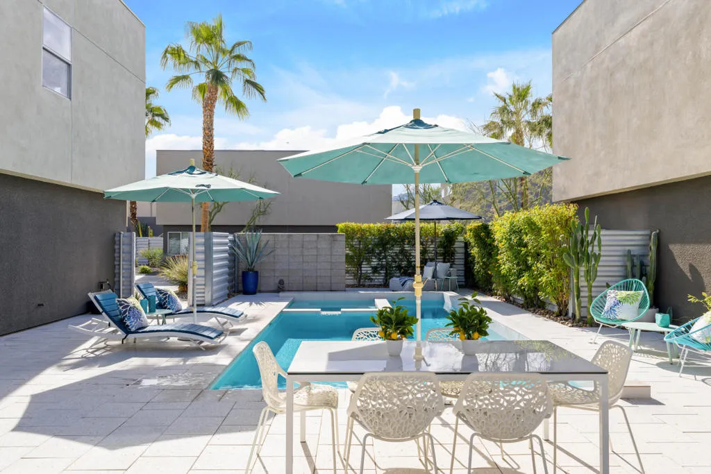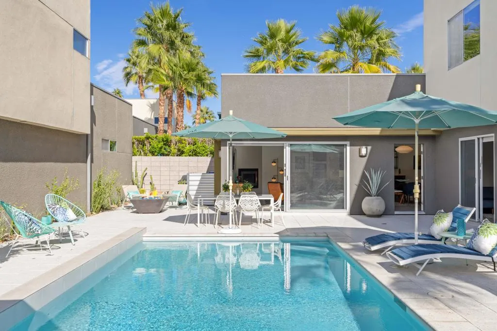 Welcome to this beautiful contemporary home in the highly desired gated community of The Morrison. This lovely three-bedroom, three-bathroom home boasts an open floor plan featuring a spacious great room with a living and dining area, 10 ft. high ceilings and dual, cornered Fleetwood sliding glass doors that open up to the outdoor patio, pool & spa. Other main level features include a bedroom/den with patio/pool access and an adjacent full bathroom, luxurious Porcelanosa tile flooring, a Chef's kitchen with Viking appliances, Caesarstone countertops, Hans Grohe fixtures, new ice-maker, stackable washer/dryer and ample storage space under the stairs. The entire home interior, including the garage, has been freshly painted. The impressive upper-level primary suite showcases lovely mountain views, a walk-in closet, and a spa-like primary bathroom with dual vanities, a large double shower and soaking tub. Rounding out the top floor is a second bedroom with ensuite bathroom and mountain views. Enjoy the spacious, private patio area that is perfect for entertaining, featuring custom pavers, professional landscaping (new lighting & irrigation), a lovely pool and spa, and a built-in gas fire pit. The 2-car garage has epoxy flooring, a newer tankless water heater and water softener & filtration systems. The roof was resurfaced 2 years ago and both A/C units were newly replaced. The Morrison homes are on fee land (you own the land), have low HOA dues, which include building property insurance and earthquake insurance. The community's premier location is close to downtown and all that Palm Springs has to offer. Being sold fully furnished (per inventory list). Don't miss this beautifully appointed home in the gated community of The Morrison in heart of Palm Springs.