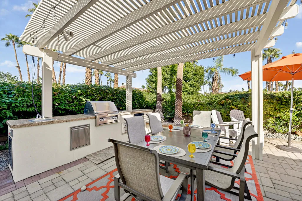 Welcome to this beautifully appointed 4-bedroom residence offering 2,596 square feet (EST.) of refined living in the highly sought-after gated enclave of The Links at Desert Falls Country Club. Turnkey upscale beautiful designer furniture is included in the sale, with a few exceptions--creating a move-in-ready opportunity for the buyer.From the moment you arrive, a grand double door glass entry sets the tone for the sophisticated style and warm hospitality that define this exceptional home. Step inside to soaring ceilings, abundant natural light, travertine flooring in the main living areas and a spacious layout designed for both comfort and elegance. The gourmet kitchen is a chef's delight--featuring rich cabinetry, granite countertops, stainless steel appliances, double ovens, a center island, and a charming breakfast nook overlooking the backyard. Multiple living spaces, including a formal living room, inviting family room with fireplace, and refined dining area, offer the perfect setting for both relaxed daily living and elevated entertaining. The primary suite is a serene retreat with backyard access, a cozy sitting area, fireplace, and a spa-inspired bathroom. Three additional guest bedrooms provide wonderful flexibility for visitors, home office needs, or a hobby space. Two full bathrooms, a half bath and a powder room offer comfort and convenience throughout the home. A bonus room, which would be perfect for a home office, game room, hobby room or workout room. Truly a smart home with all the bells and whistles! New energy efficient windows installed throughout the entire house, as well as a new pool heater, pool pump and hot water heater. Smart home technology including keyless entry, remote pool application and smart home Ecobee thermostat controls. Outside, your private desert oasis awaits. Enjoy a sparkling pool and spa surrounded by bountiful fruit trees, lush landscaping with mature hedges that create a true privacy lot. Multiple seating and dining areas, along with a built-in BBQ under the pergola, make this backyard perfectly suited for year-round desert living. Located in one of Palm Desert's most desirable guard-gated communities, The Links at Desert Falls offers a picturesque setting, beautifully maintained grounds, and close proximity to world-class golf, tennis, shopping and dining!
